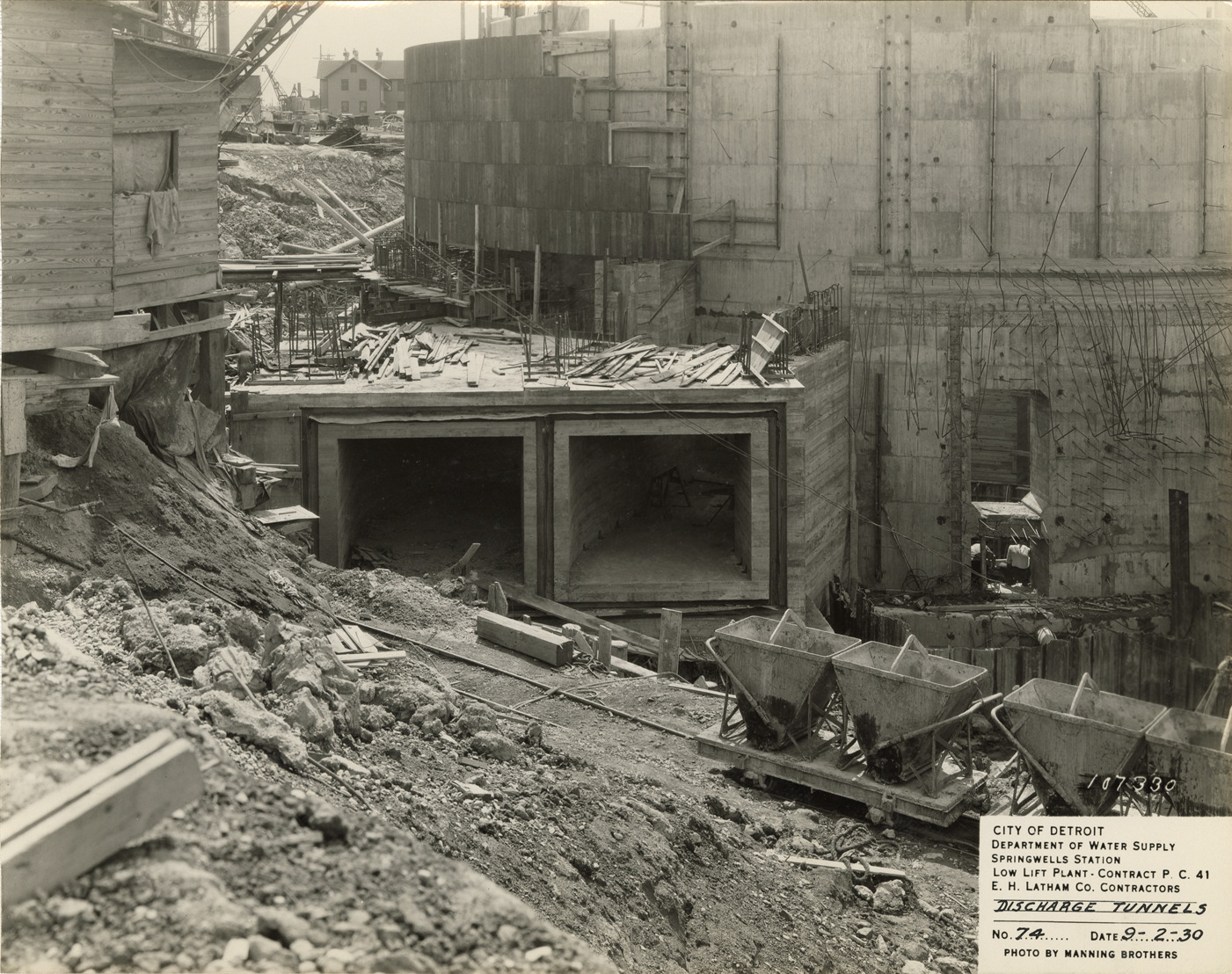 View of discharge tunnels at low lift plant in the Springwells Station treatment plant during construction, Detroit water supply system. Printed on front: "City of Detroit. Department of Water Supply. Springwells Station. Low lift plant. Contract P.C. 41. E.C. Latham Co., contractors. Discharge tunnels. No. 74. Date: 9-2-30. Photo by Manning Brothers."