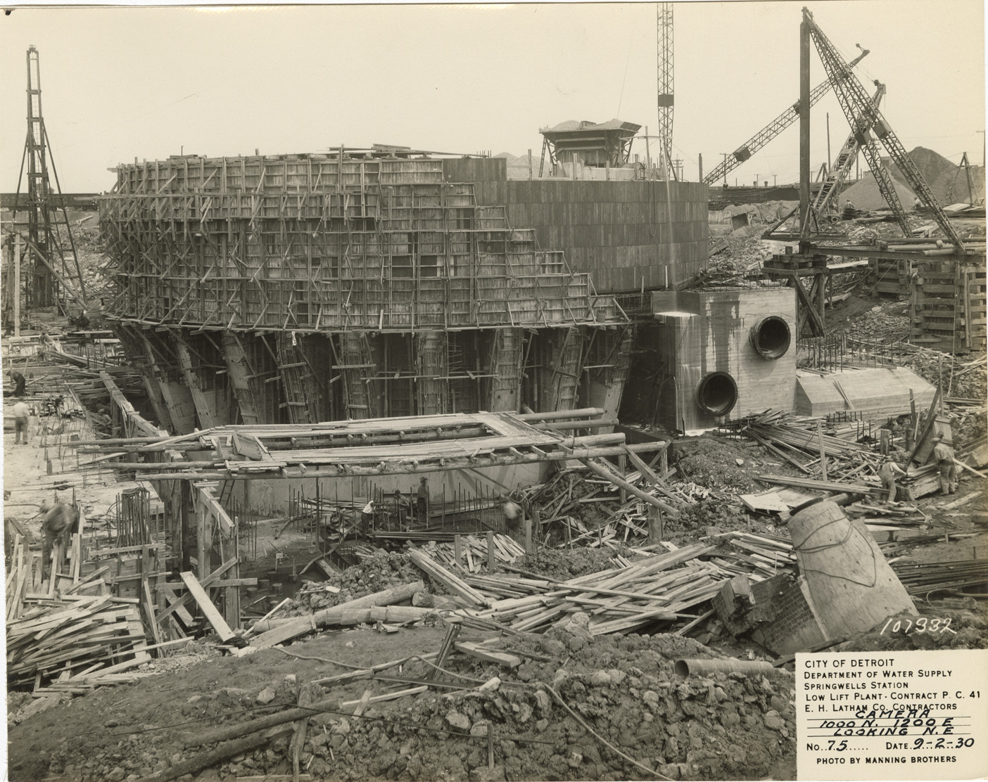 View of low lift plant in the Springwells Station treatment plant during construction, Detroit water supply system. Cranes on construction site. Printed on front: "City of Detroit. Department of Water Supply. Springwells Station. Low lift plant. Contract P.C. 41. E.C. Latham Co., contractors. Camera 1000N 1200E, looking N.E. No. 75. Date: 9-2-30. Photo by Manning Brothers."