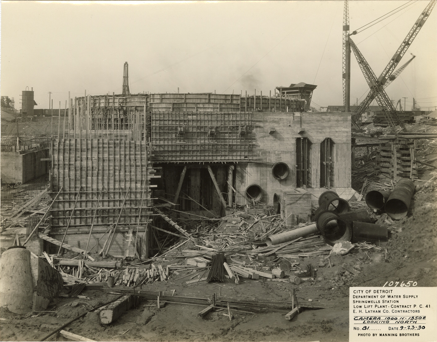 View of low lift plant in the Springwells Station treatment plant during construction, Detroit water supply system. Printed on front: "City of Detroit. Department of Water Supply. Springwells Station. Low lift plant. Contract P.C. 41. E.C. Latham Co., contractors. Camera 1000N-1350E looking north. No. 81. Date: 9-23-30. Photo by Manning Brothers."