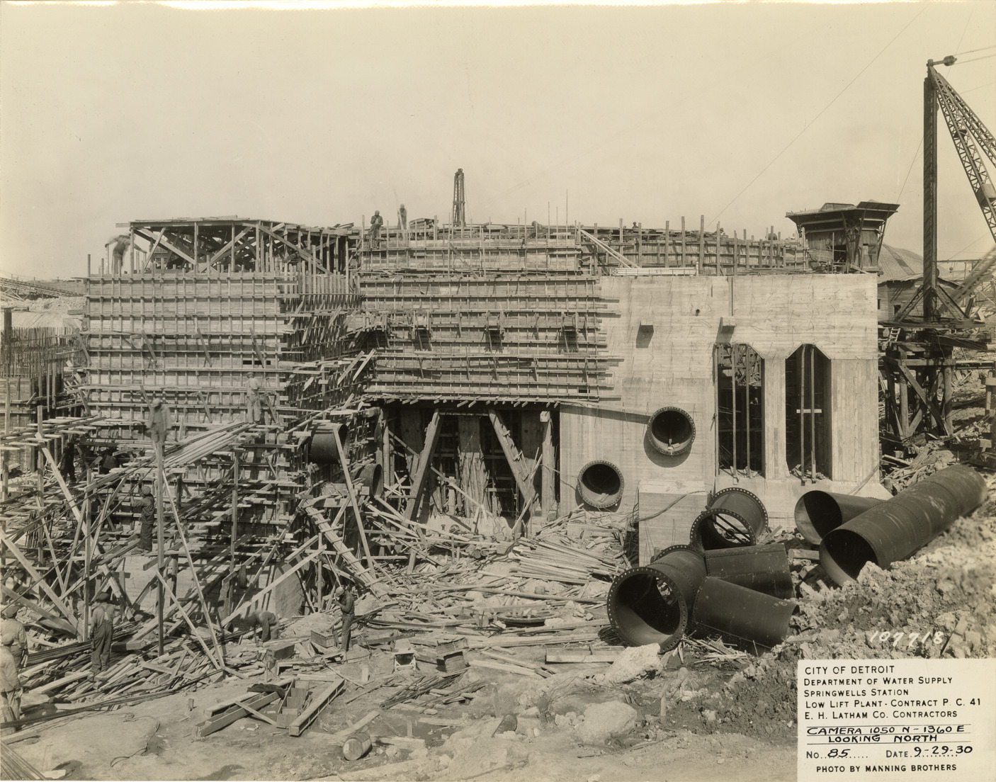View of low lift plant in the Springwells Station treatment plant during construction, Detroit water supply system. Printed on front: "City of Detroit. Department of Water Supply. Springwells Station. Low lift plant. Contract P.C. 41. E.C. Latham Co., contractors. Camera 1050N-1360E looking north. No. 85. Date: 9-29-30. Photo by Manning Brothers."