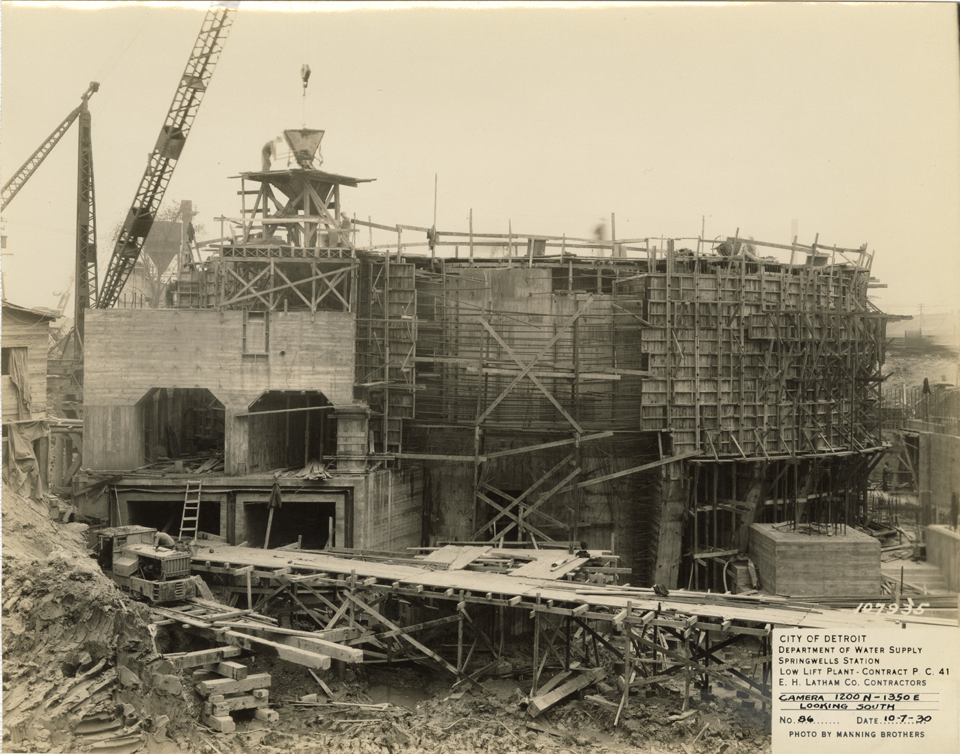 View of low lift plant in the Springwells Station treatment plant during construction, Detroit water supply system. Printed on front: "City of Detroit. Department of Water Supply. Springwells Station. Low lift plant. Contract P.C. 41. E.C. Latham Co., contractors. Camera 1200N-1350E looking south. No. 86. Date: 10-7-30. Photo by Manning Brothers."