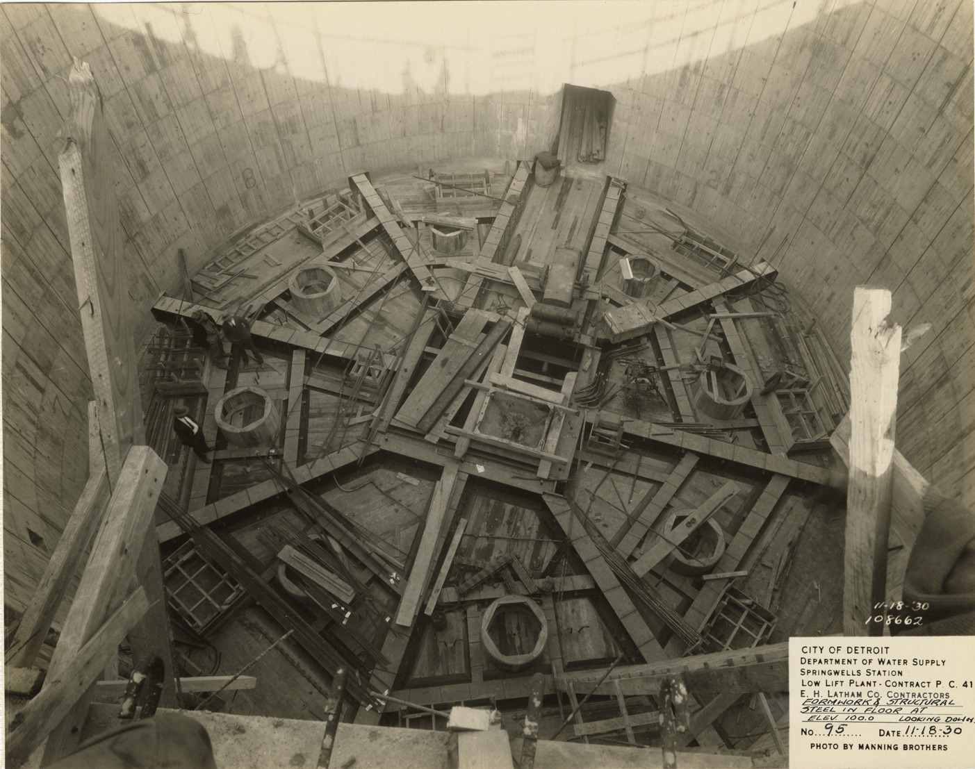 Overhead view of low lift plant in the Springwells Station treatment plant during construction, Detroit water supply system. Printed on front: "City of Detroit. Department of Water Supply. Springwells Station. Low lift plant. Contract P.C. 41. E.C. Latham Co., contractors. Formwork & structural steel in floor at elev. 100.0 looking down. No. 95. Date: 11-18-30. Photo by Manning Brothers."