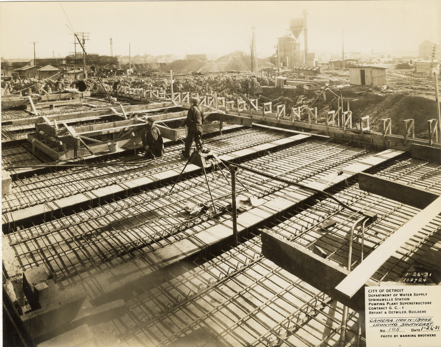 View of workers at the pumping plant superstructure in the Springwells Station treatment plant during construction, Detroit water supply system. Printed on front: "City of Detroit. Department of Water Supply. Springwells Station. Pumping plant superstructure. Contract G.C. 1. Bryant & Detwiler, builders. Camera 1100N-1300E looking southeast. No. 105. Date: 1-26-31. Photo by Manning Brothers."