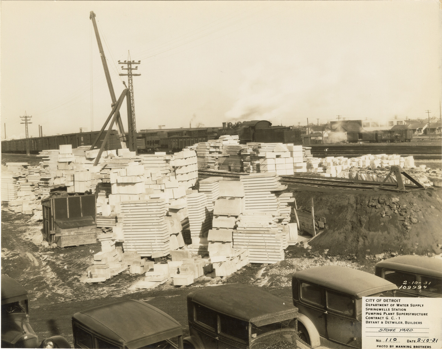 View of stone yard for the pumping plant superstructure in the Springwells Station treatment plant during construction, Detroit water supply system. Automobiles in foreground. Printed on front: "City of Detroit. Department of Water Supply. Springwells Station. Pumping plant superstructure. Contract G.C. 1. Bryant & Detwiler, builders. Stone yard. No. 110. Date: 2-10-31. Photo by Manning Brothers."