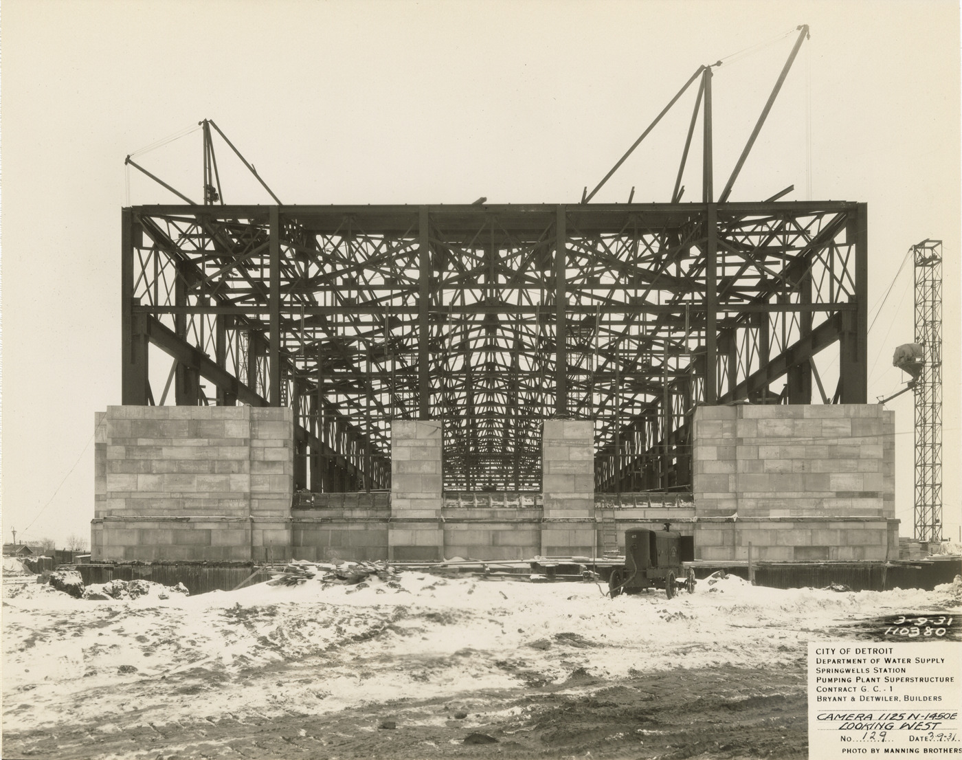 View of structural framework of the pumping plant superstructure in the Springwells Station treatment plant during construction, Detroit water supply system. Printed on front: "City of Detroit. Department of Water Supply. Springwells Station. Pumping plant superstructure. Contract G.C. 1. Bryant & Detwiler, builders. Camera 1125N-1450E looking west. No. 129. Date: 3-9-31. Photo by Manning Brothers."