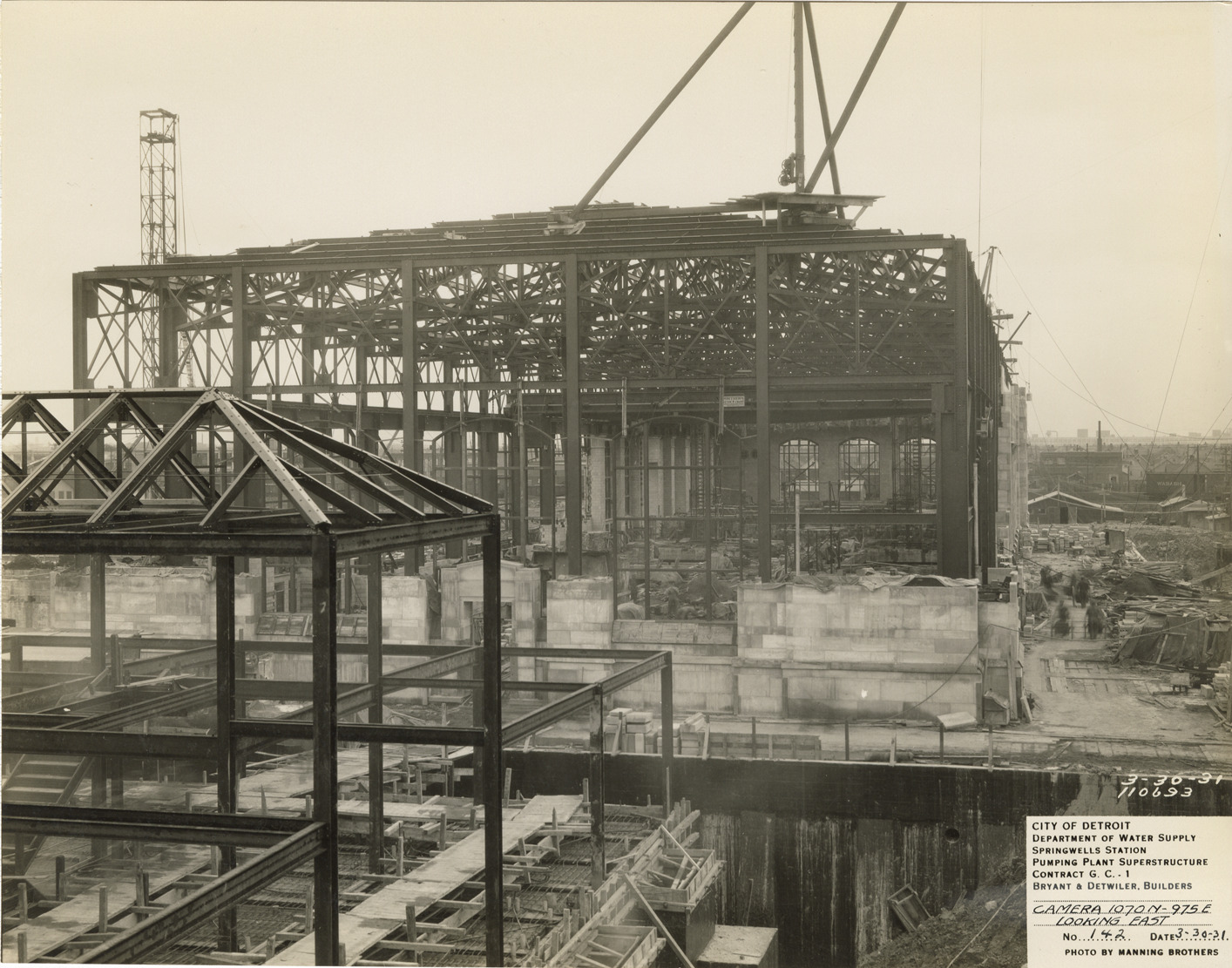 View of structural framework with partially completed facade of the pumping plant superstructure in the Springwells Station treatment plant during construction, Detroit water supply system. Printed on front: "City of Detroit. Department of Water Supply. Springwells Station. Pumping plant superstructure. Contract G.C. 1. Bryant & Detwiler, builders. Camera 1070N-975E looking east. No. 142. Date: 3-30-31. Photo by Manning Brothers."