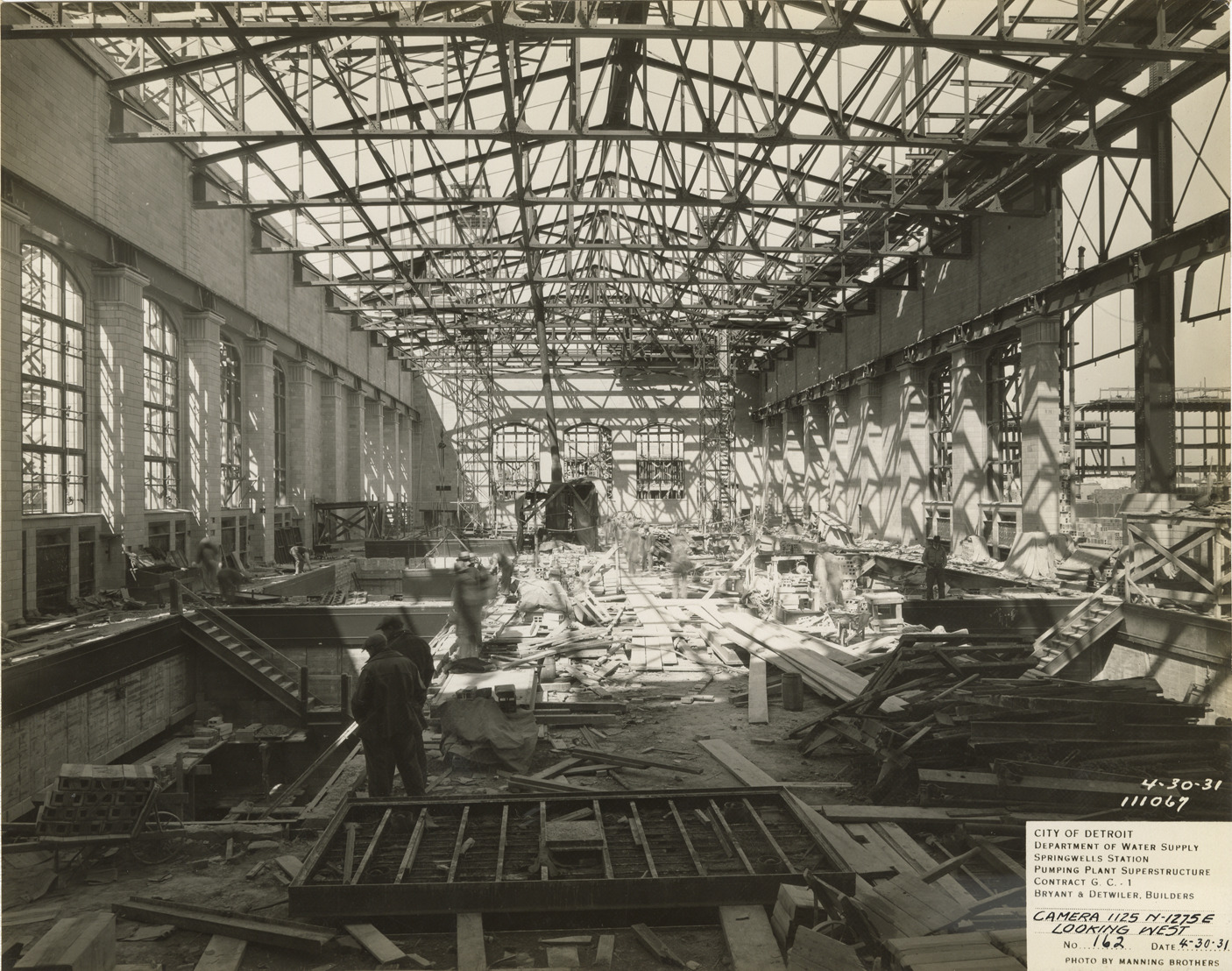 View of workers in the interior of structural framework of the pumping plant superstructure, Springwells Station treatment plant during construction, Detroit water supply system. Printed on front: "City of Detroit. Department of Water Supply. Springwells Station. Pumping plant superstructure. Contract G.C. 1. Bryant & Detwiler, builders. Camera 1125N-1275E looking west. No. 162. Date: 4-30-31. Photo by Manning Brothers."