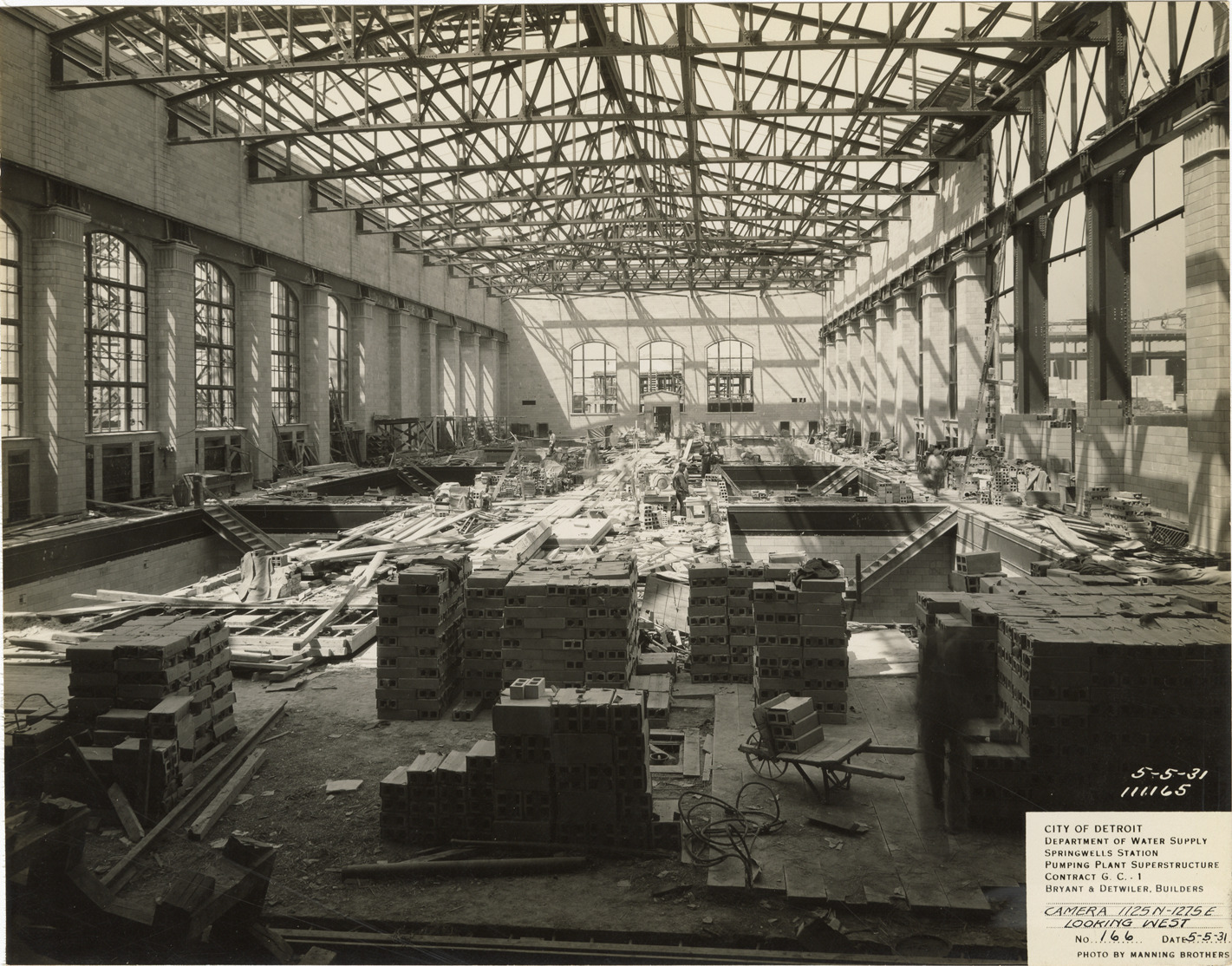 View of workers in the interior of structural framework of the pumping plant superstructure, Springwells Station treatment plant during construction, Detroit water supply system. Printed on front: "City of Detroit. Department of Water Supply. Springwells Station. Pumping plant superstructure. Contract G.C. 1. Bryant & Detwiler, builders. Camera 1125N-1275E looking west. No. 166. Date: 5-5-31. Photo by Manning Brothers."