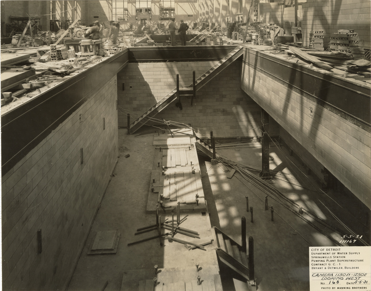 View of workers in the interior of the pumping plant superstructure, Springwells Station treatment plant during construction, Detroit water supply system. Printed on front: "City of Detroit. Department of Water Supply. Springwells Station. Pumping plant superstructure. Contract G.C. 1. Bryant & Detwiler, builders. Camera 1150N-1250E looking west. No. 168. Date: 5-5-31. Photo by Manning Brothers."
