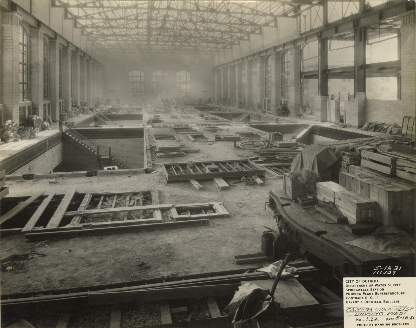 View of the pumping plant superstructure in the Springwells Station treatment plant during construction, Detroit water supply system. Printed on front: "City of Detroit. Department of Water Supply. Springwells Station. Pumping plant superstructure. Contract G.C. 1. Bryant & Detwiler, builders. Camera 1125N-1275E looking west. No. 172. Date: 5-18-31. Photo by Manning Brothers."