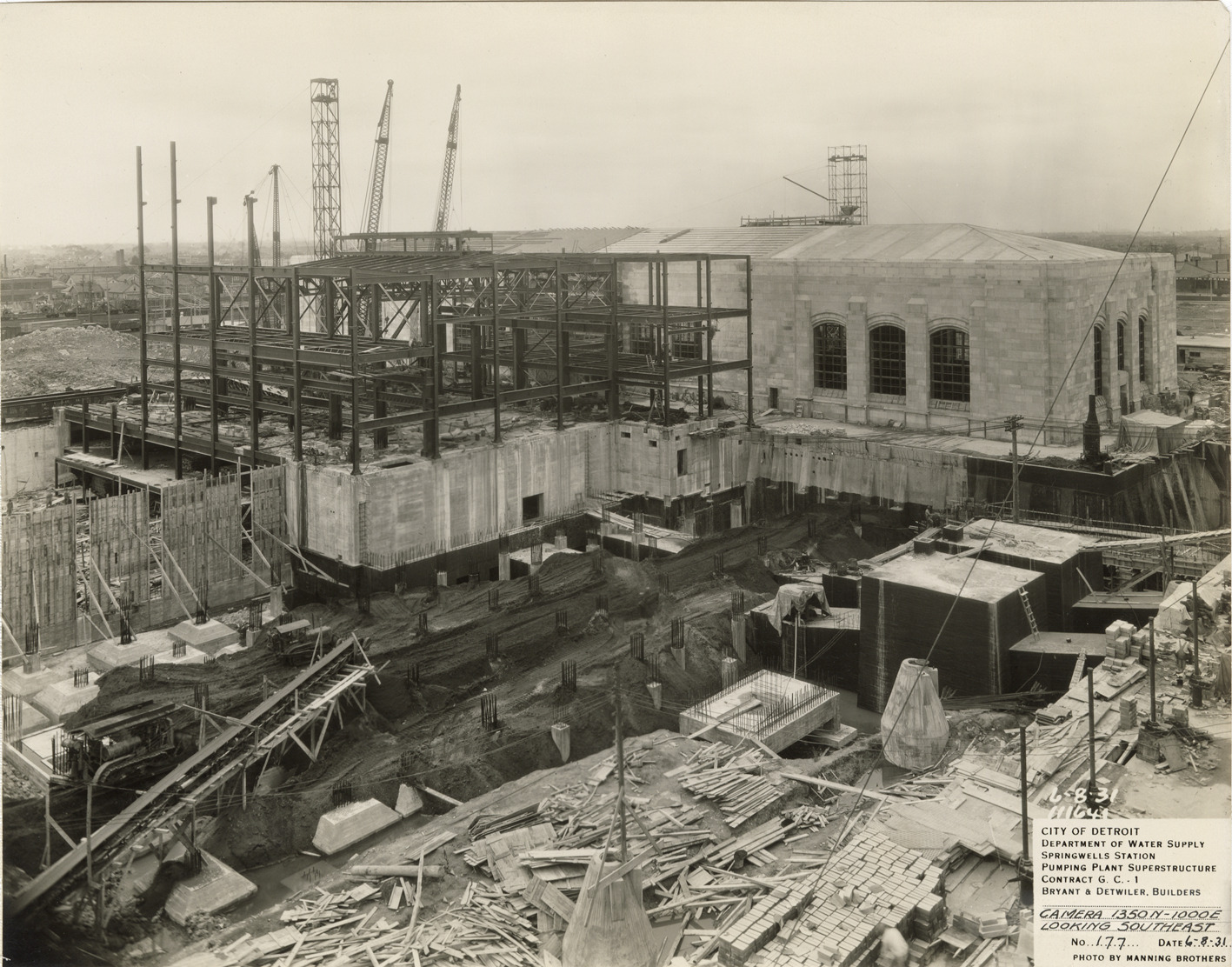 View of structural framework with partially completed facade of the pumping plant superstructure in the Springwells Station treatment plant during construction, Detroit water supply system. Printed on front: "City of Detroit. Department of Water Supply. Springwells Station. Pumping plant superstructure. Contract G.C. 1. Bryant & Detwiler, builders. Camera 1350N-1000E looking southeast. No. 177. Date: 6-8-31. Photo by Manning Brothers."