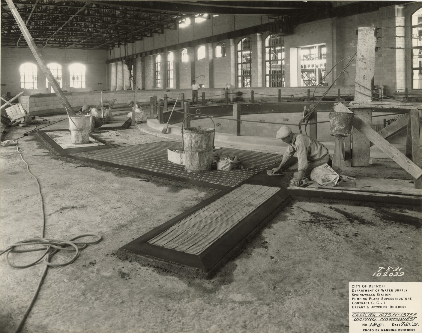 View of workers at pumping plant superstructure in the Springwells Station treatment plant during construction, Detroit water supply system. Printed on front: "City of Detroit. Department of Water Supply. Springwells Station. Pumping plant superstructure. Contract G.C. 1. Bryant & Detwiler, builders. Camera 1075N-1375E looking northwest. No. 185. Date: 7-8-31. Photo by Manning Brothers."