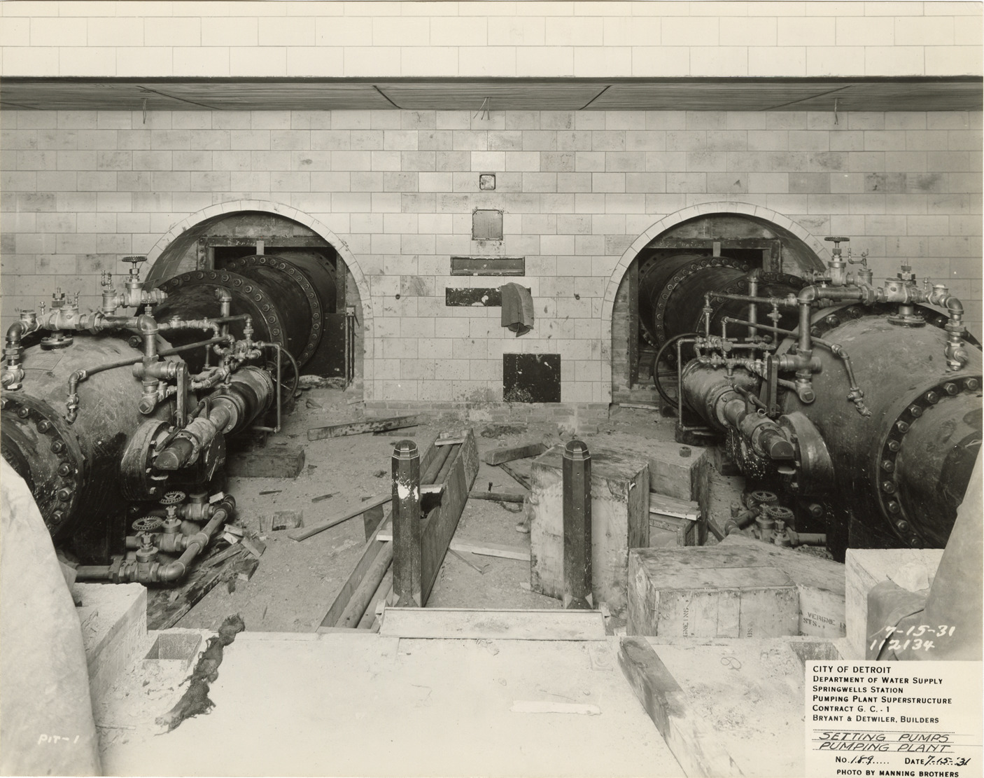 View of setting pumps in the pumping plant superstructure at the Springwells Station treatment plant during construction, Detroit water supply system. Printed on front: "City of Detroit. Department of Water Supply. Springwells Station. Pumping plant superstructure. Contract G.C. 1. Bryant & Detwiler, builders. Setting pumps, pumping plant. No. 189. Date: 7-15-31. Photo by Manning Brothers."
