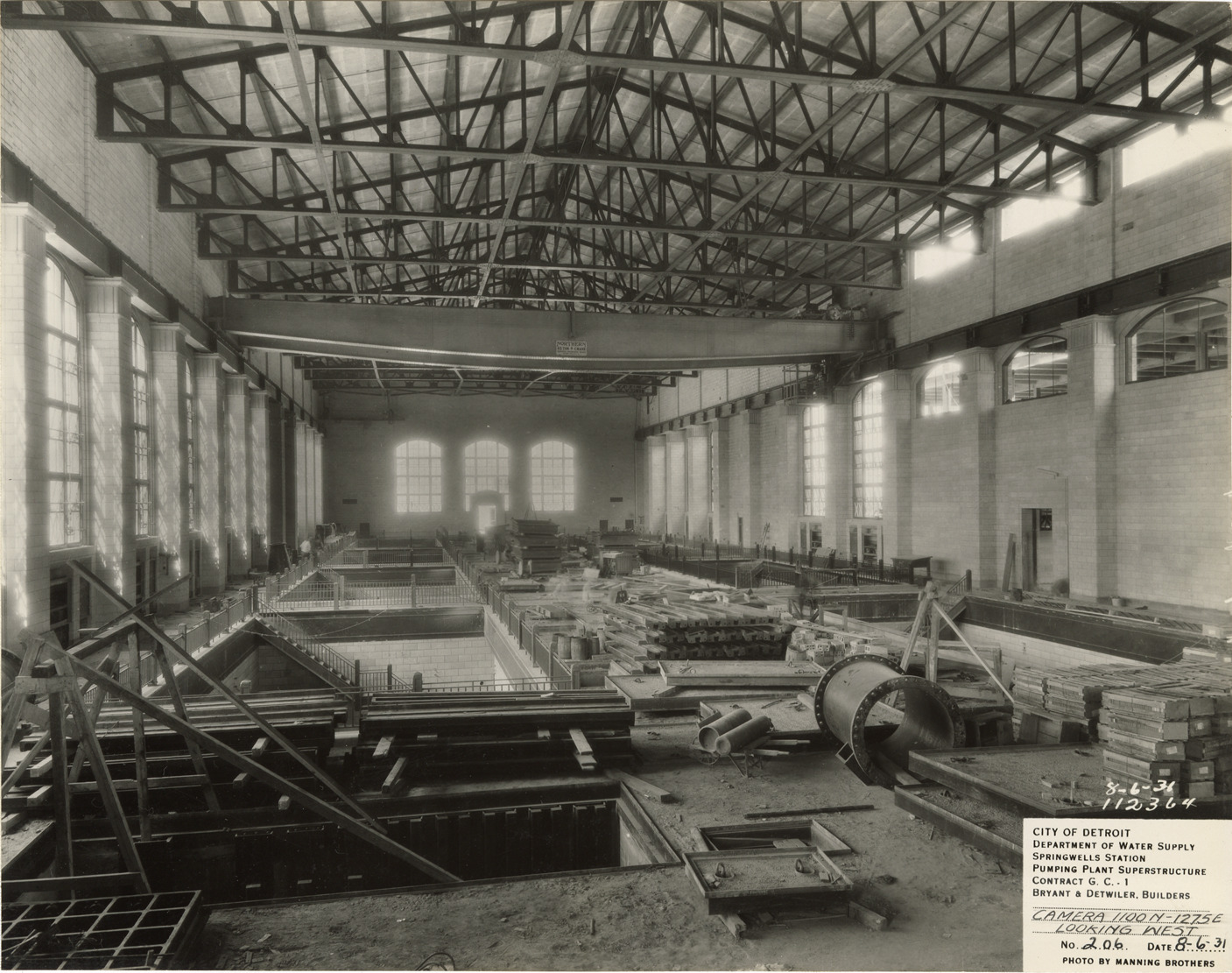 View of the interior of the pumping plant superstructure in the Springwells Station treatment plant during construction, Detroit water supply system. Printed on front: "City of Detroit. Department of Water Supply. Springwells Station. Pumping plant superstructure. Contract G.C. 1. Bryant & Detwiler, builders. Interior view, pumping plant. No. 206. Date: 8-6-31. Photo by Manning Brothers."