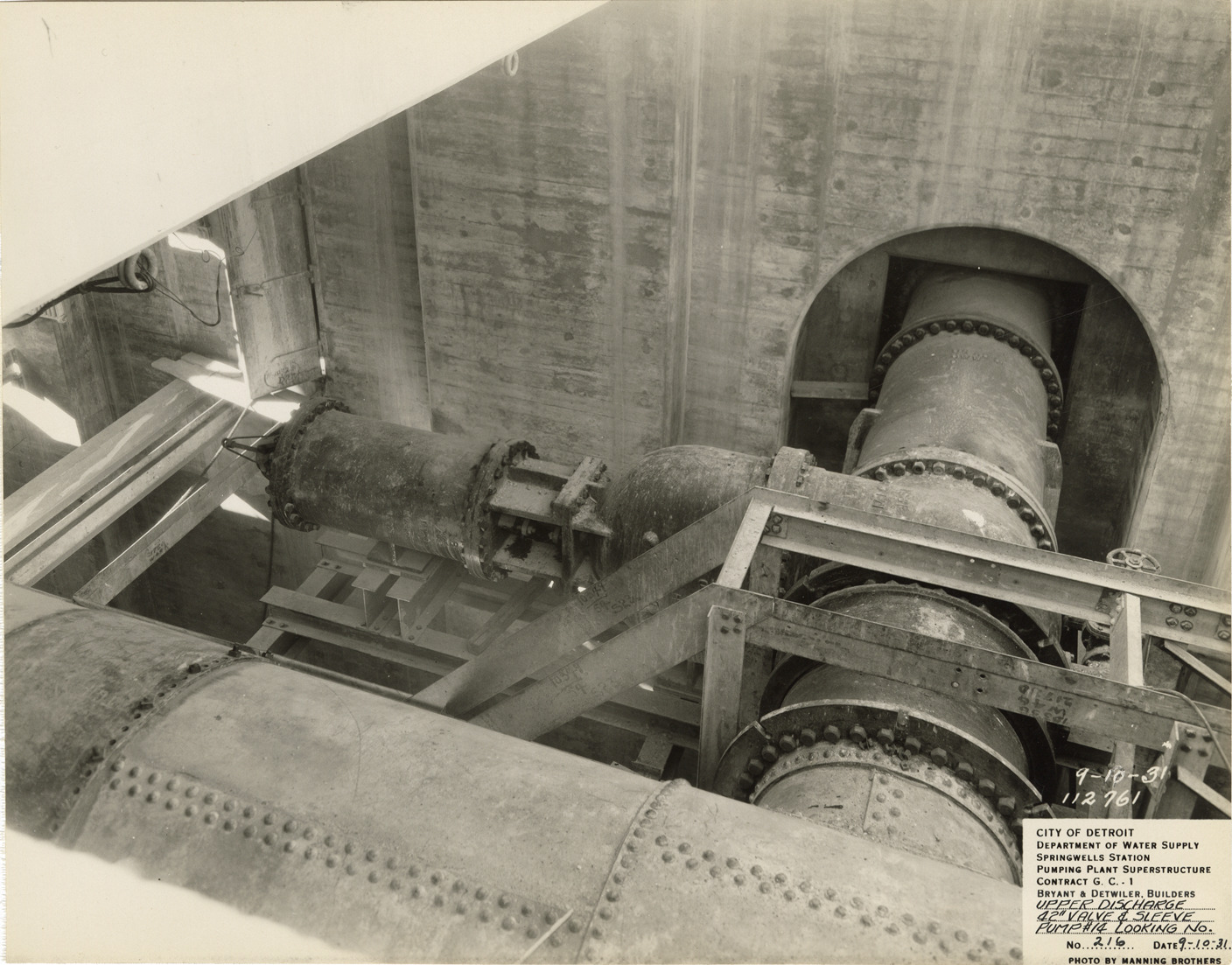 View of upper discharge valve and sleeve for pump no. 14 in the pumping plant superstructure in the Springwells Station treatment plant during construction, Detroit water supply system. Printed on front: "City of Detroit. Department of Water Supply. Springwells Station. Pumping plant superstructure. Contract G.C. 1. Bryant & Detwiler, builders. Upper discharge 42" valve & sleeve, pump #14 looking no. No. 216. Date: 9-10-31. Photo by Manning Brothers."