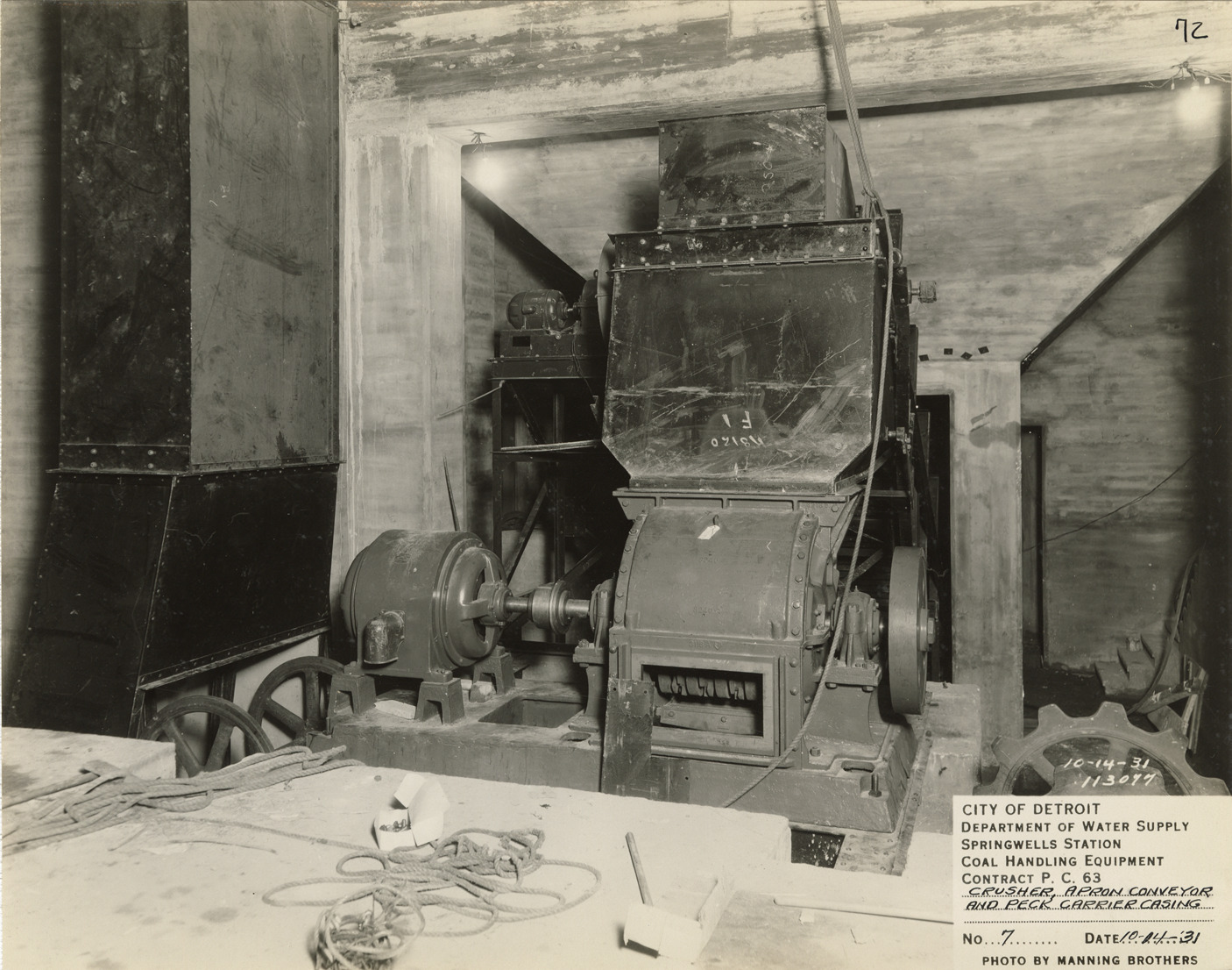 View of crusher, apron conveyor and Peck carrier casing in the Springwells Station treatment plant during construction, Detroit water supply system. Printed on front: "City of Detroit. Department of Water Supply. Springwells Station. Coal handling equipment. Contract P.C. 63. Crusher, apron conveyor and Peck carrier casing. No. 7. Date: 10-14-31. Photo by Manning Brothers."