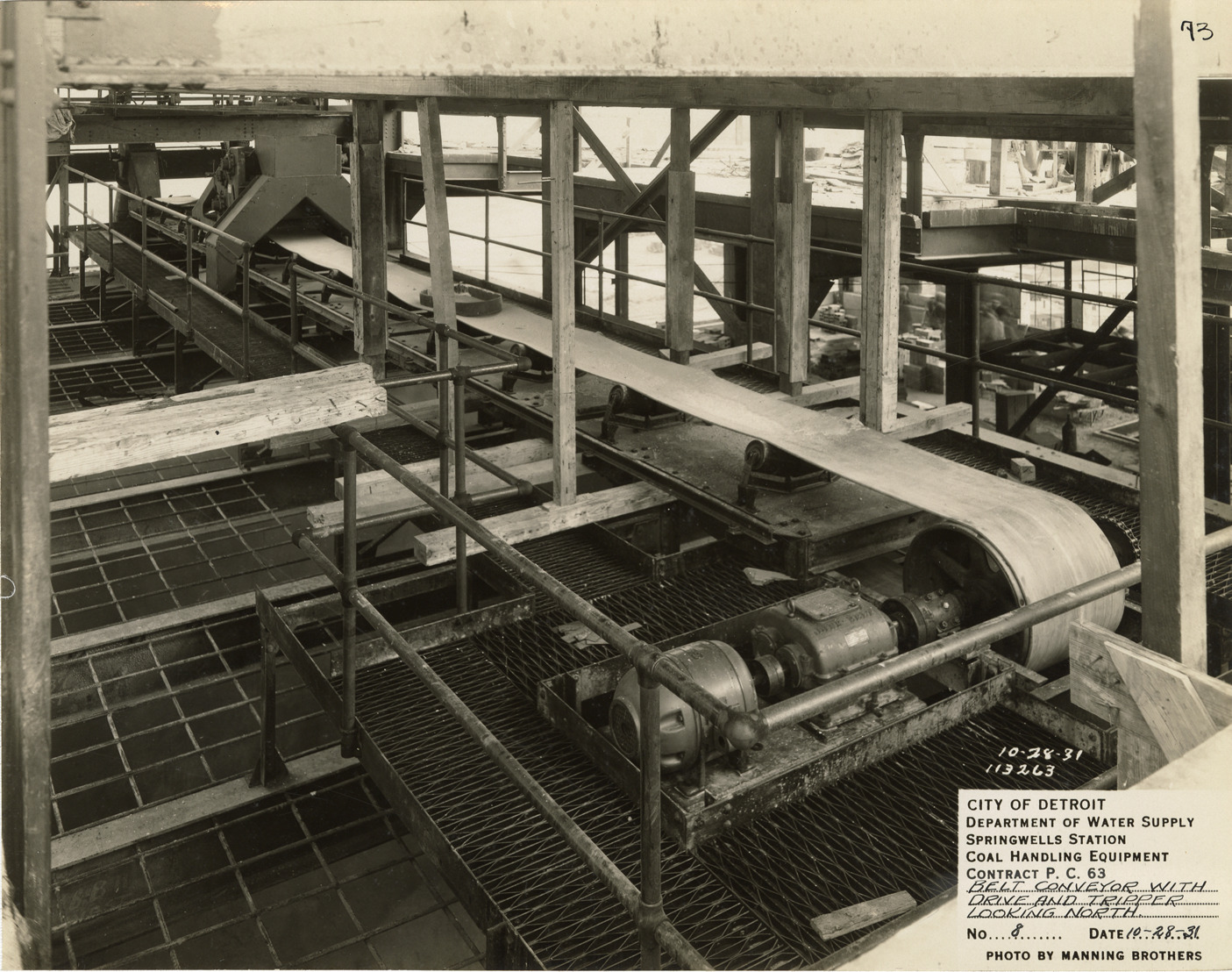 View of belt conveyor in the Springwells Station treatment plant during construction, Detroit water supply system. Printed on front: "City of Detroit. Department of Water Supply. Springwells Station. Coal handling equipment. Contract P.C. 63. Belt conveyor with drive and tripper looking north. No. 8. Date: 10-28-31. Photo by Manning Brothers."