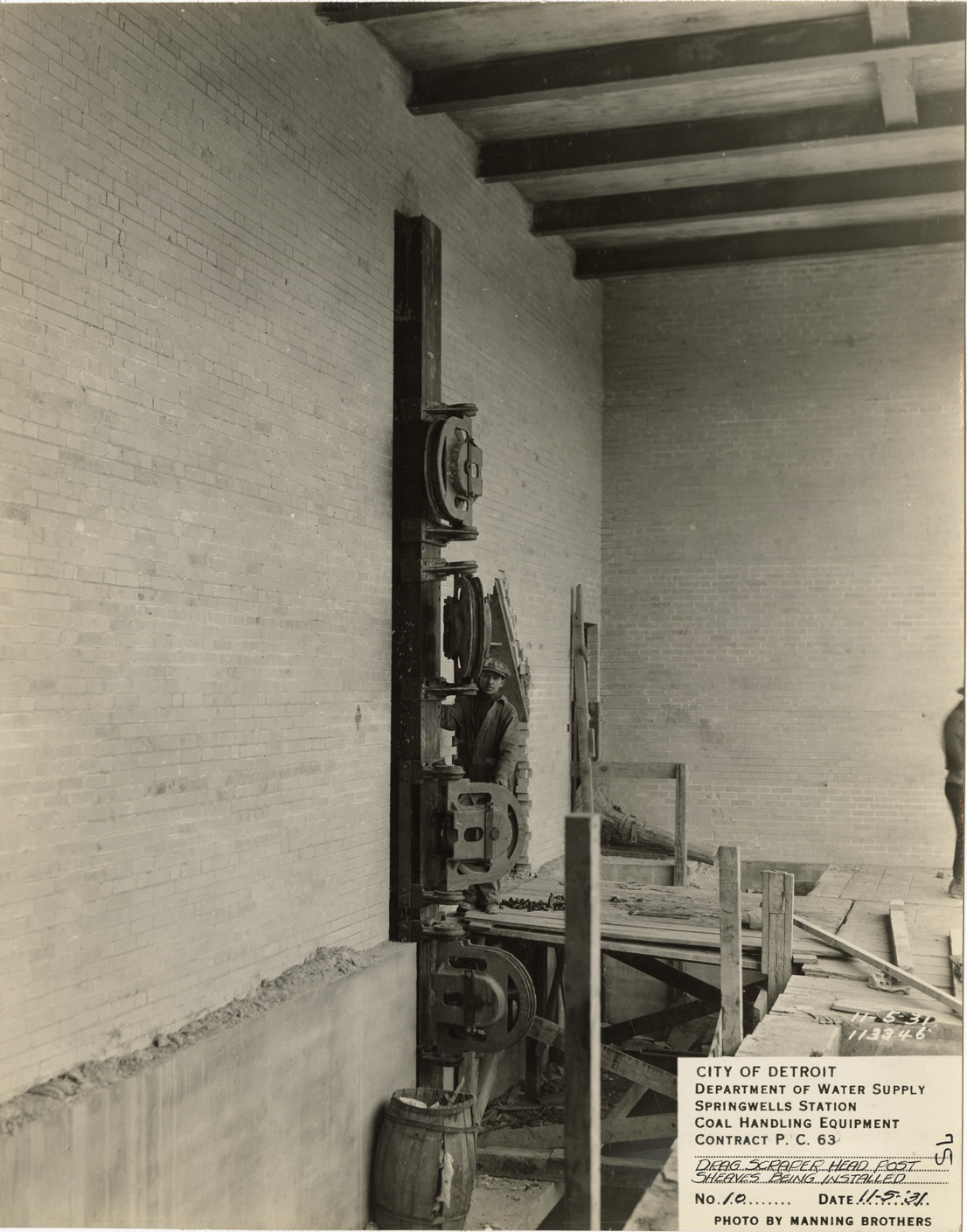 View of worker posing with a drag scraper in the Springwells Station treatment plant during construction, Detroit water supply system. Printed on front: "City of Detroit. Department of Water Supply. Springwells Station. Coal handling equipment. Contract P.C. 63. Drag scraper head post sheaves being installed. No. 10. Date: 11-5-31. Photo by Manning Brothers."