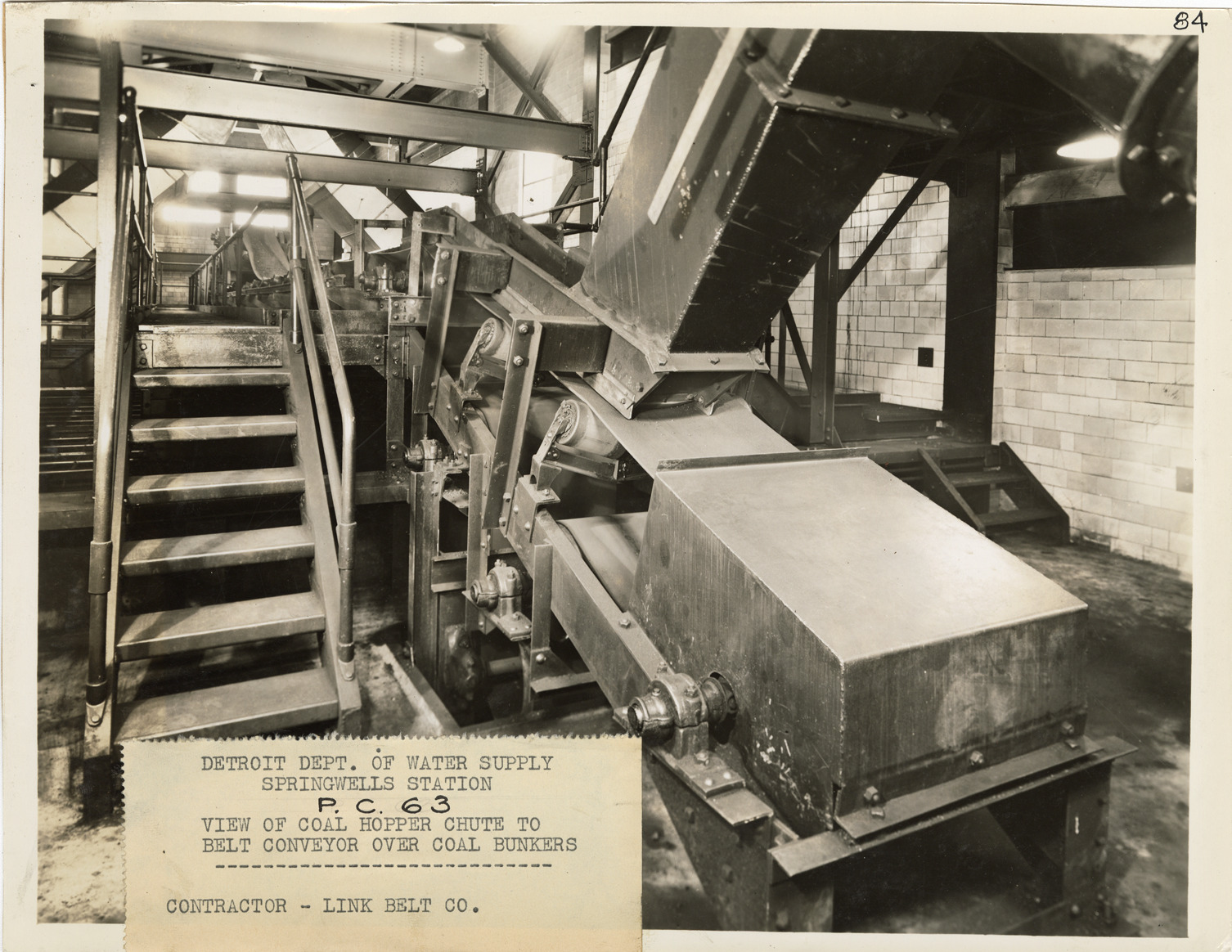 Coal hopper chute to belt conveyor, Springwells Station treatment plant during construction, Detroit water supply system