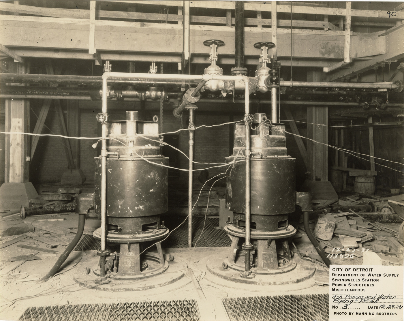 View of ash pumps and water piping in the Springwells Station treatment plant during construction, Detroit water supply system. Printed on front: "City of Detroit. Department of Water Supply. Springwells Station. Power structures. Miscellaneous. PC-68. Ash pumps and water piping. No. 3. Date: 12-23-31. Photo by Manning Bros."