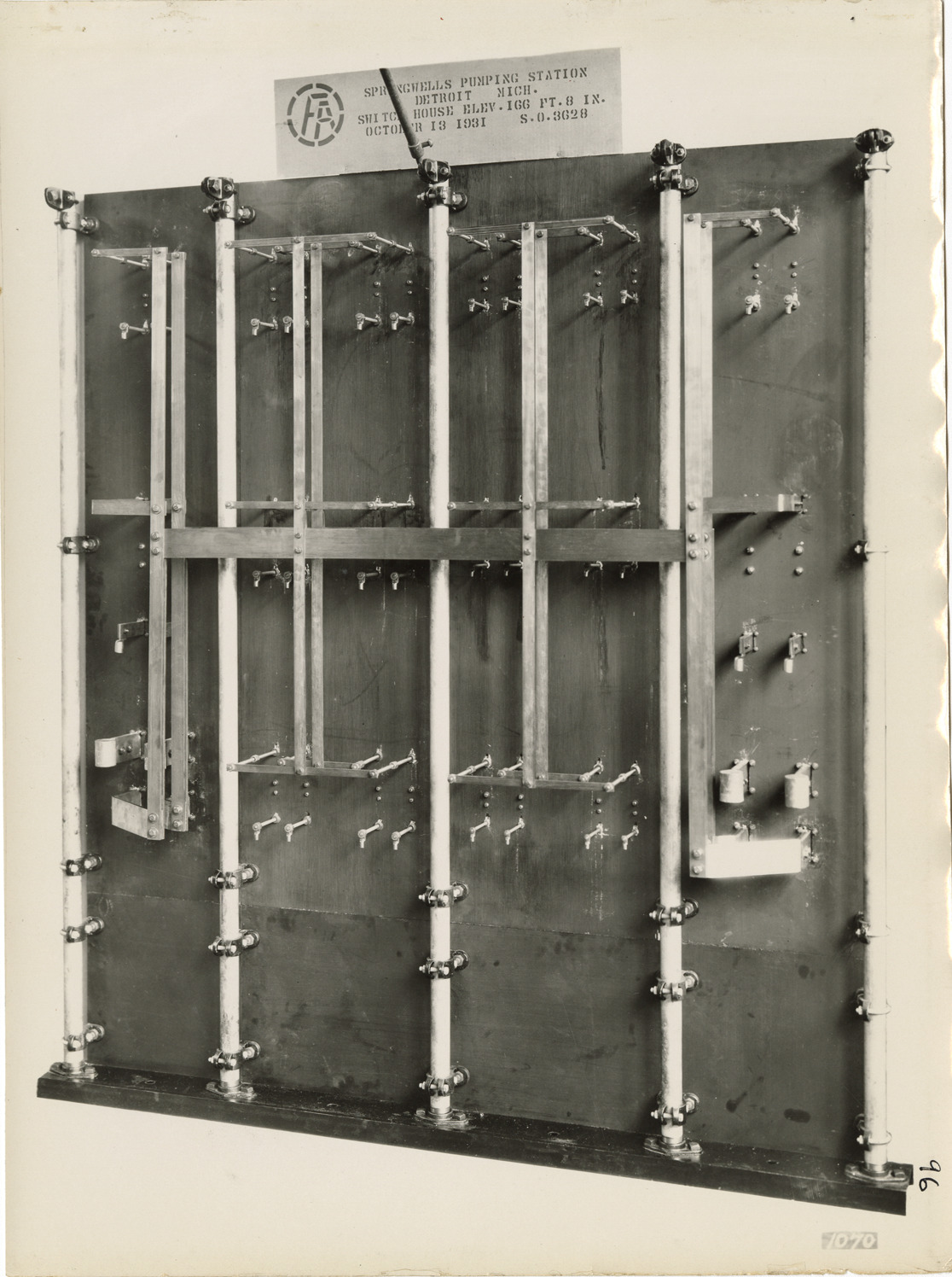 View of control panel for switch house in the Springwells Station treatment plant during construction, Detroit water supply system. Sign over panel reads: "Springwells Pumping Station, Detroit, Mich. Switch house. Elev. 166 ft. 8 in. October 31, 1931. S.O. 3628."