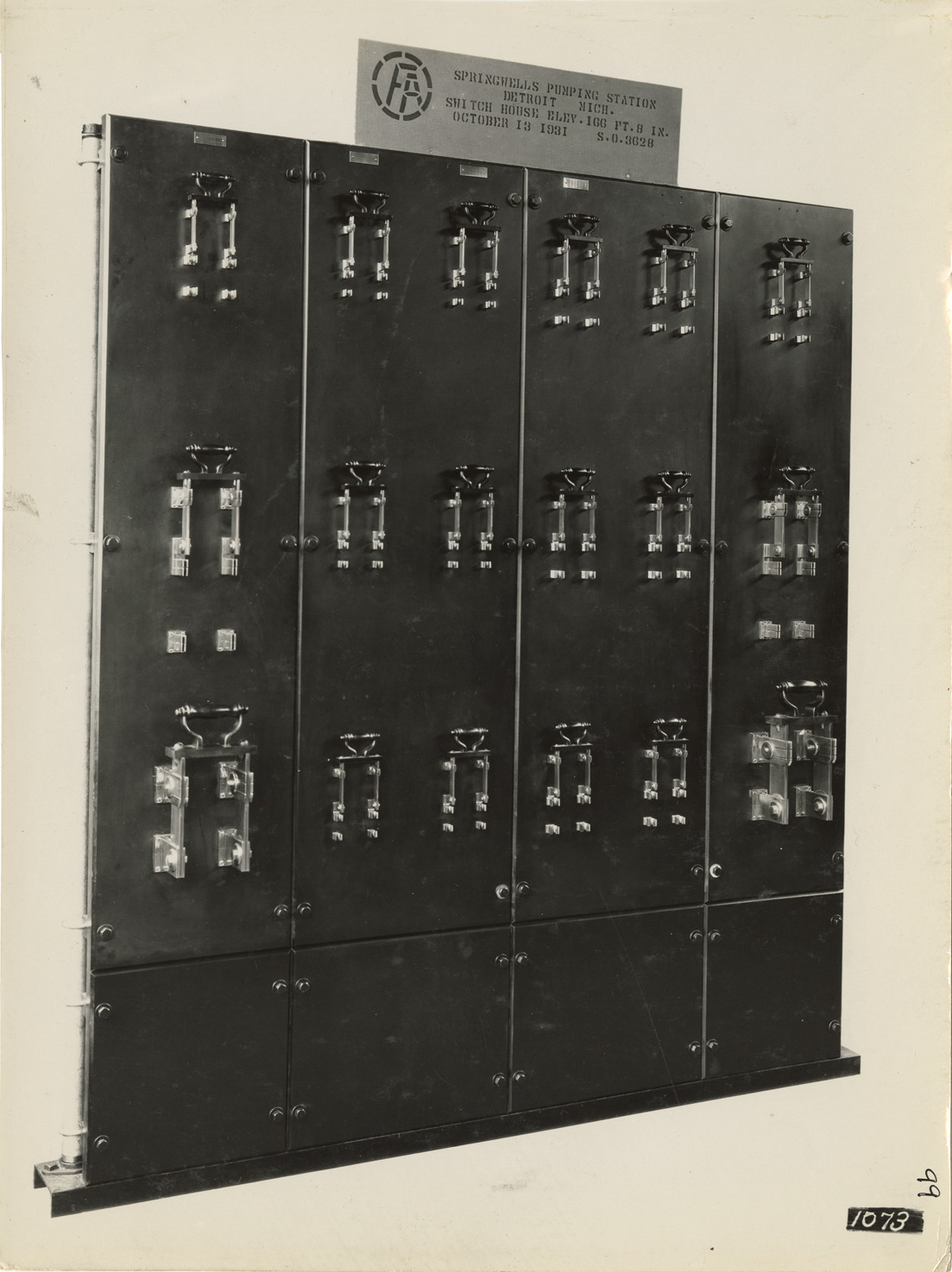 View of control panel for switch house in the Springwells Station treatment plant during construction, Detroit water supply system. Sign over panel reads: "Springwells Pumping Station, Detroit, Mich. Switch house. Elev. 166 ft. 8 in. October 31, 1931. S.O. 3628."