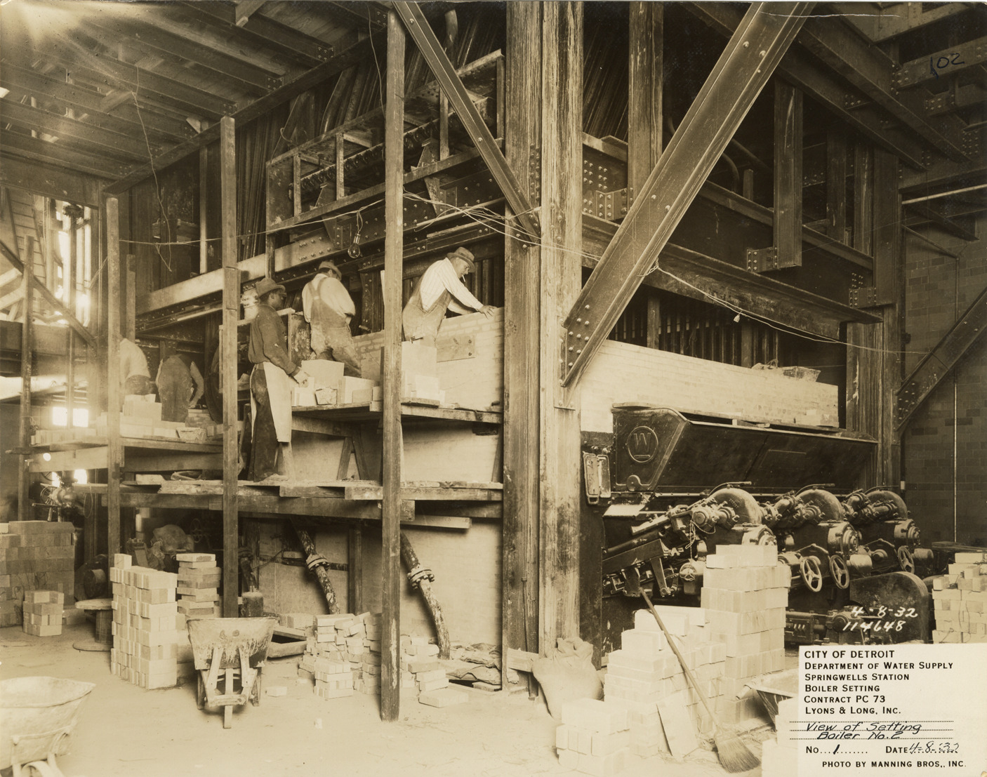 View of workers building a boiler setting in the Springwells Station treatment plant during construction, Detroit water supply system. Printed on front: "City of Detroit. Department of Water Supply. Springwells Station. Boiler setting. Contract PC 73. Lyons & Long, Inc. View of setting boiler no. 2. No. 1. Date: 4-8-32. Photo by Manning Bros., Inc."