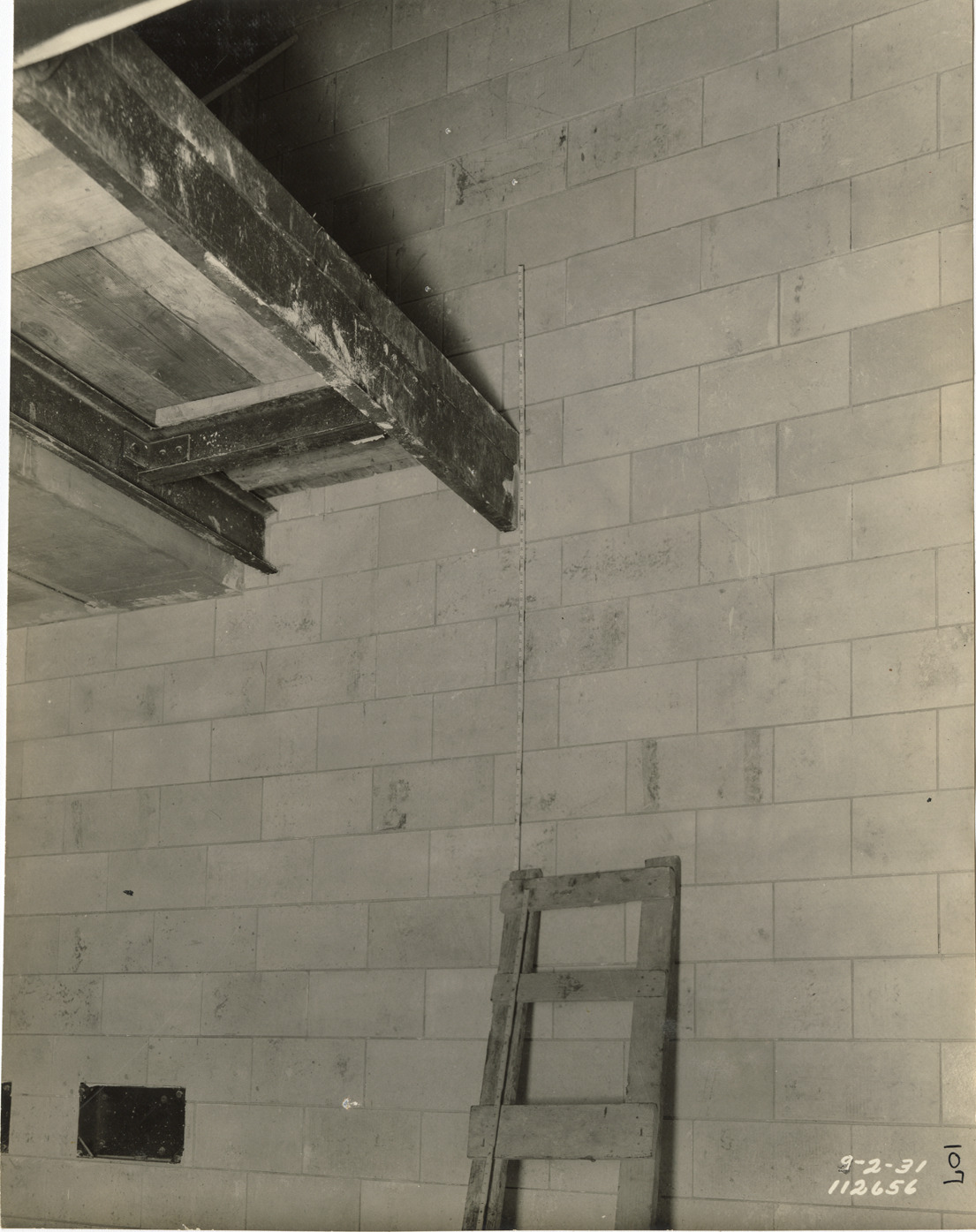 View of pump pit no. 8 in the Springwells Station treatment plant during construction, Detroit water supply system. Stamped on back: "Manning Bros., commercial photographers. 504-505 Lincoln Building. Corner State and Park Sts., Detroit, Mich." Typed on back: "Springwells Pumping Station, pump pit #8. View showing location of ladder and air duct where Mr. A.U. Chamier, Field Engineer of Construction was injured on September 1, 1931. Photograph made September 2, 1931."