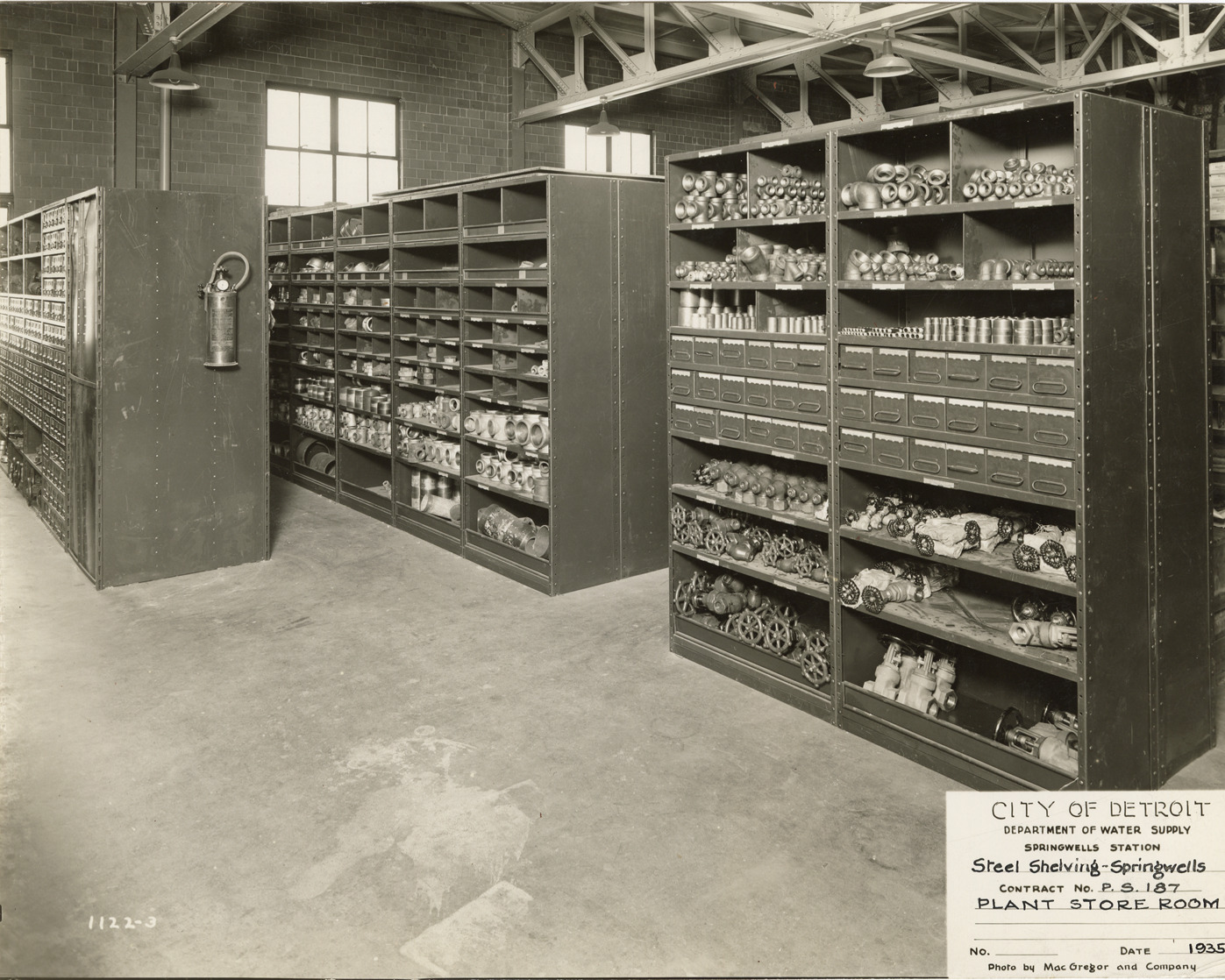 View of steel shelving in the plant storeroom of the Springwells Station treatment plant during construction, Detroit water supply system. Printed on front: "City of Detroit. Department of Water Supply. Springwells Station. Steel shelving, Springwells. Contract no. P.S. 187. Plant store room. No. [blank]. Date: 1935. Photo by MacGregor and Company."