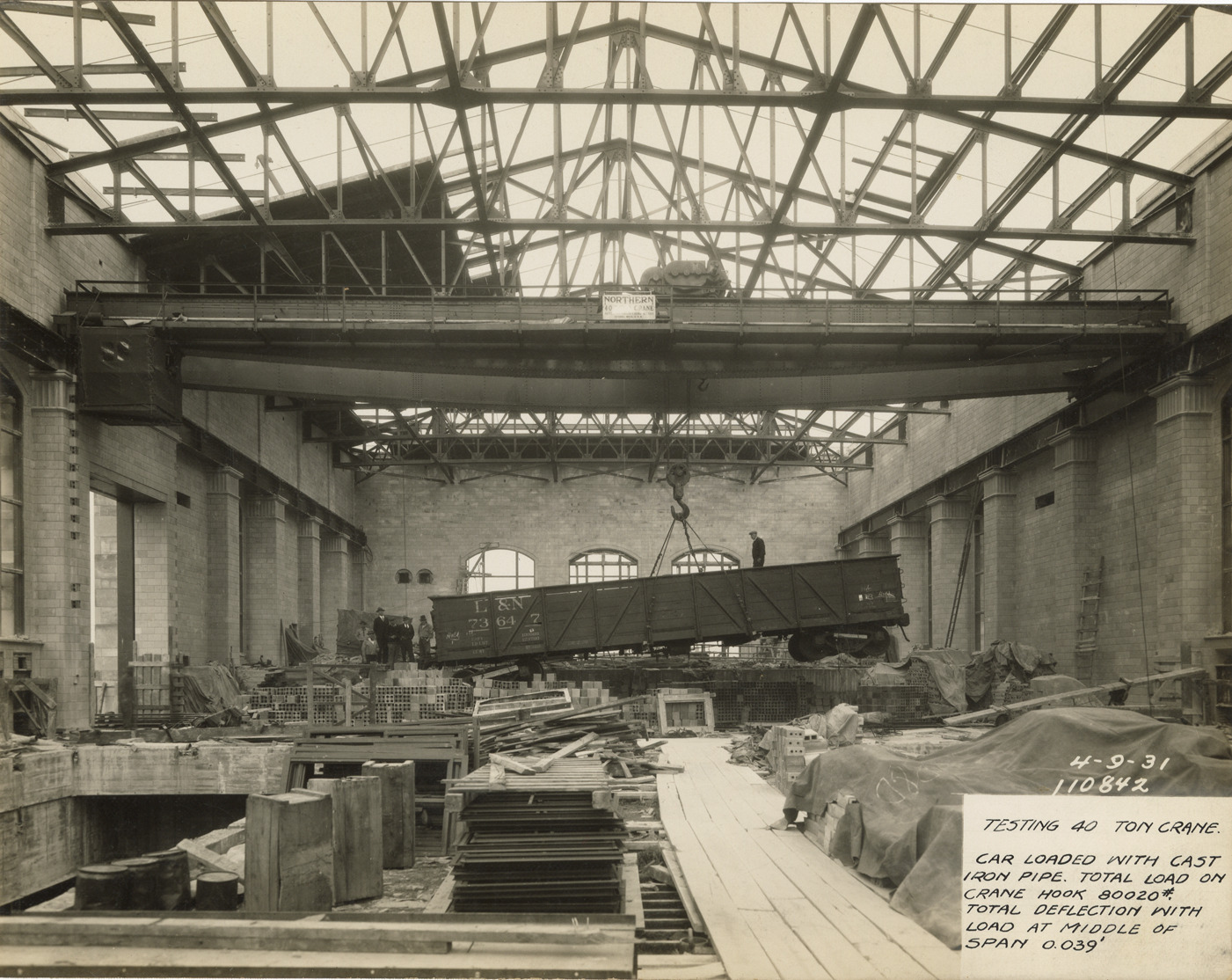 View of men watching a 40 ton crane lift railroad car loaded with cast iron pipe in the Springwells Station treatment plant during construction, Detroit water supply system. Printed on front: "4-9-31. Testing 40 ton crane. Car loaded with cast iron pipe. Total load on crane hook 800020#. Total deflection with load at middle of span 0.039'." Stamped on back: "Manning Bros., commercial photographers. 504-505 Lincoln Building. Corner State and Park Sts., Detroit, Mich." Handwritten on back: "Testing 40 ton crane. Car loaded with cast iron pipe. Total load on crane hook 800020#. Total deflection with load at middle of span 0.039'."