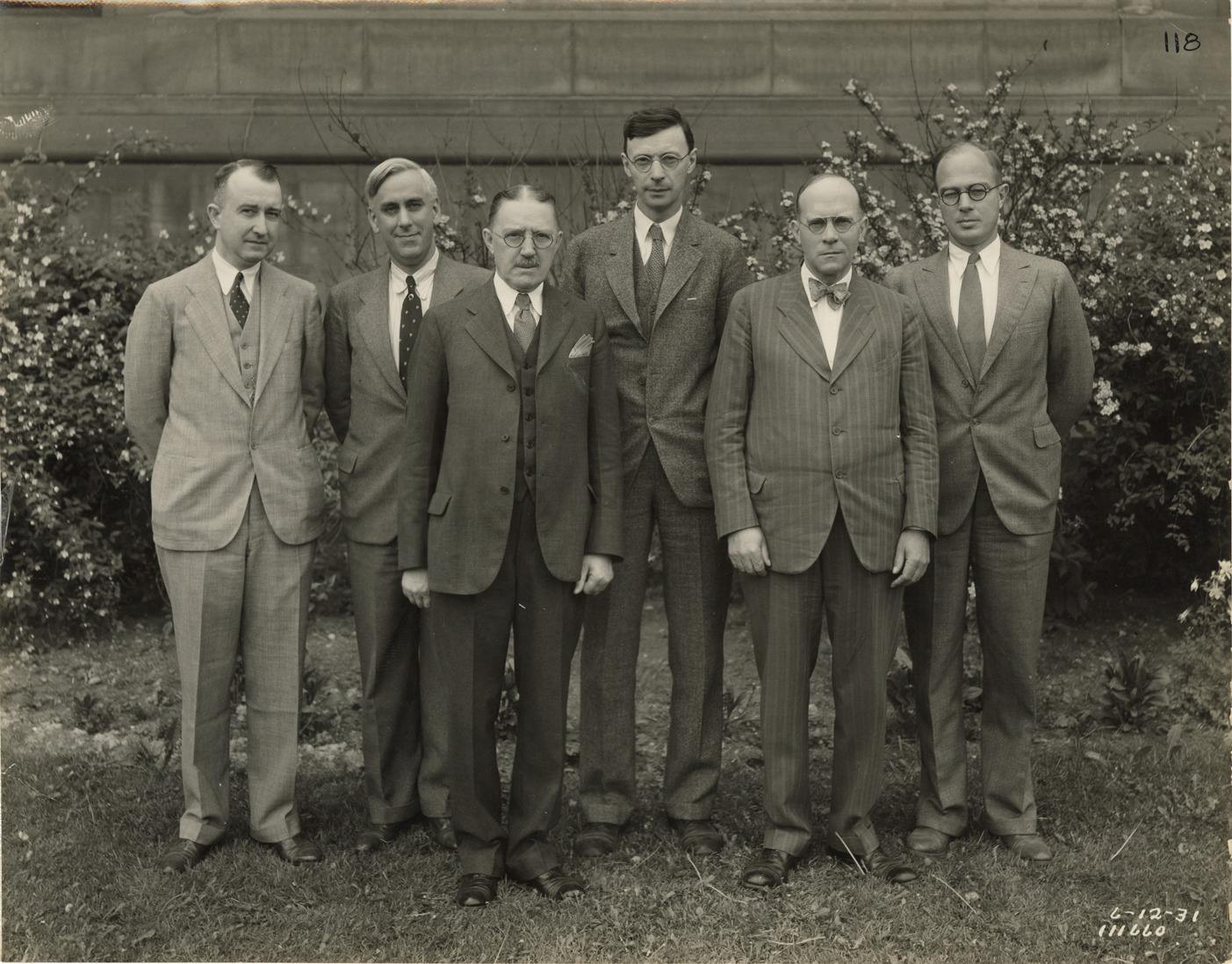 Group portrait of six unidentified men, wearing suits, at the Springwells Station treatment plant during construction, Detroit water supply system. Printed on front: "6-12-31." Stamped on back: "Manning Bros., commercial photographers. 504-505 Lincoln Building. Corner State and Park Sts., Detroit, Mich."