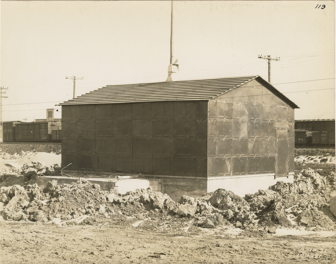 View of temporary switch house at the Springwells Station treatment plant during construction, Detroit water supply system. Printed on front: "2-10-31." Stamped on back: "Manning Bros., commercial photographers. 504-505 Lincoln Building. Corner State and Park Sts., Detroit, Mich." Handwritten on back: "Temporary switch house."