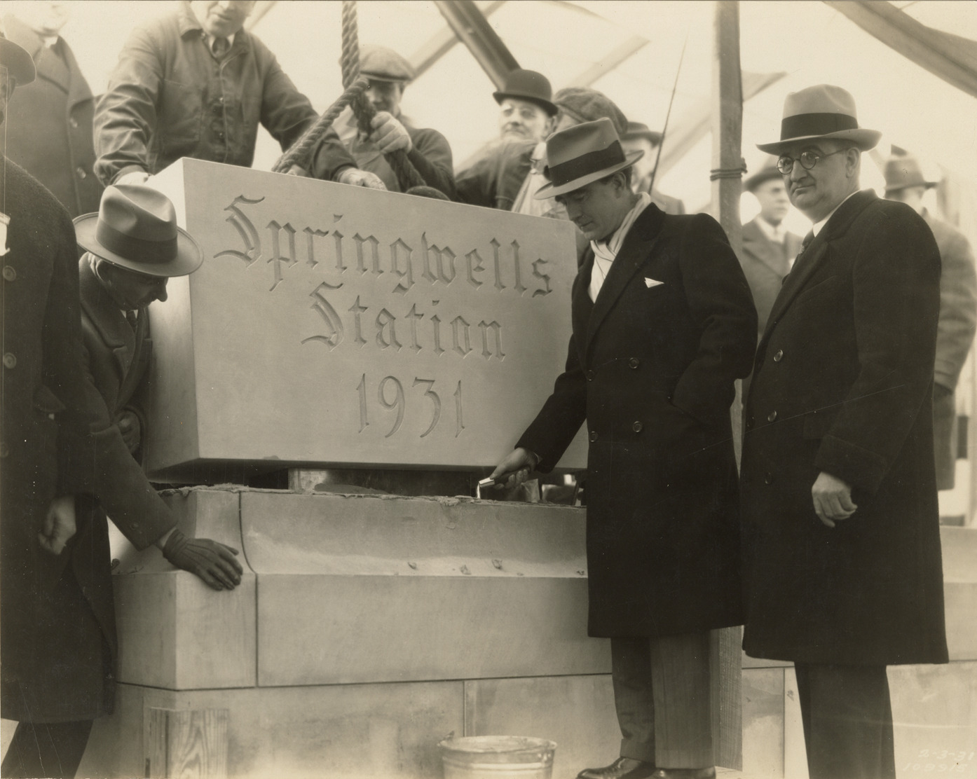 View of Mayor Frank Murphy, Commissioner William T. Skrzycki and other men at the cornerstone laying at the Springwells Station treatment plant, Detroit water supply system. Stone is inscribed: "Springwells Station, 1931." Printed on front: "2-3-31." Stamped on back: "Manning Bros., commercial photographers. 504-505 Lincoln Building. Corner State and Park Sts., Detroit, Mich." Typed on back: "Mayor Frank Murphy and Commissioner William T. Skrzycki. Cornerstone laying. February 3, 1931."