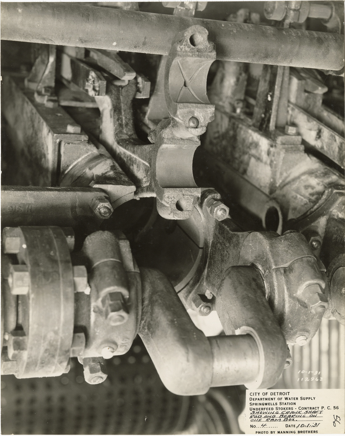 Close-up view of stoker, showing crankshaft rod and bearing on ram box, in the Springwells Station treatment plant during construction, Detroit water supply system. Printed on front: "City of Detroit. Department of Water Supply. Springwells Station. Underfeed stokers. Contract P.C. 56. Showing crank shaft rod and bearing on one ram box. No. 4. Date: 10-1-31. Photo by Manning Brothers."