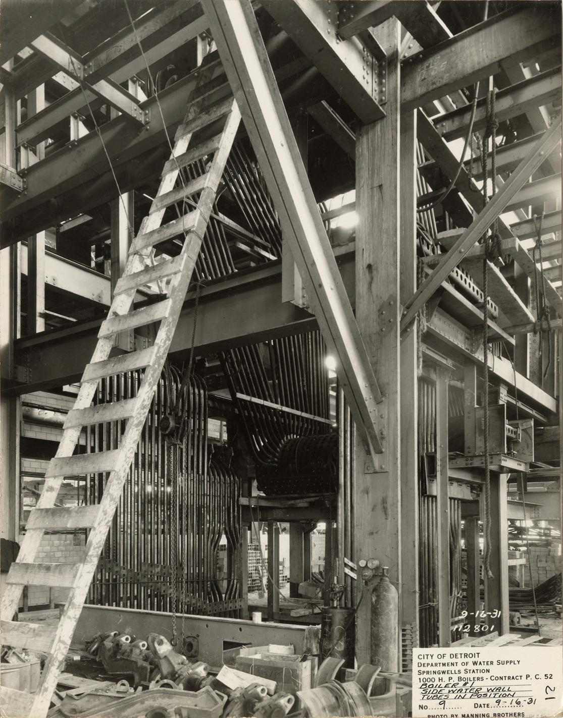 View of boiler in the Springwells Station treatment plant during construction, Detroit water supply system. Printed on front: "City of Detroit. Department of Water Supply. Springwells Station. 1000 h.p. boilers. Contract P.C. 52. Boiler #1. Side water wall tubes in position. No. 9. Date: 9-16-31. Photo by Manning Brothers."