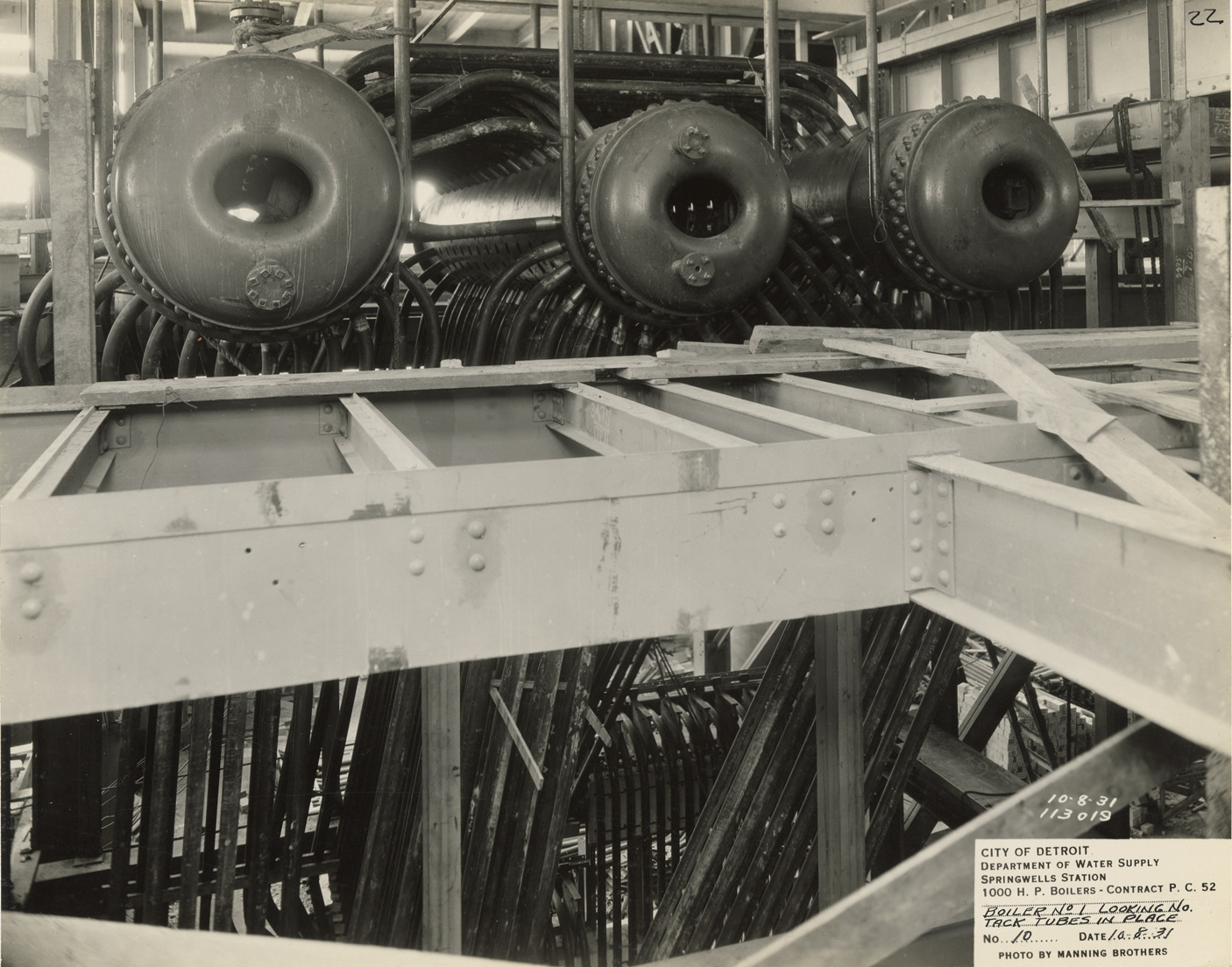 View of boiler in the Springwells Station treatment plant during construction, Detroit water supply system. Printed on front: "City of Detroit. Department of Water Supply. Springwells Station. 1000 h.p. boilers. Contract P.C. 52. Boiler no. 1. Looking no. Tack tubes in place. No. 10. Date: 10-8-31. Photo by Manning Brothers."