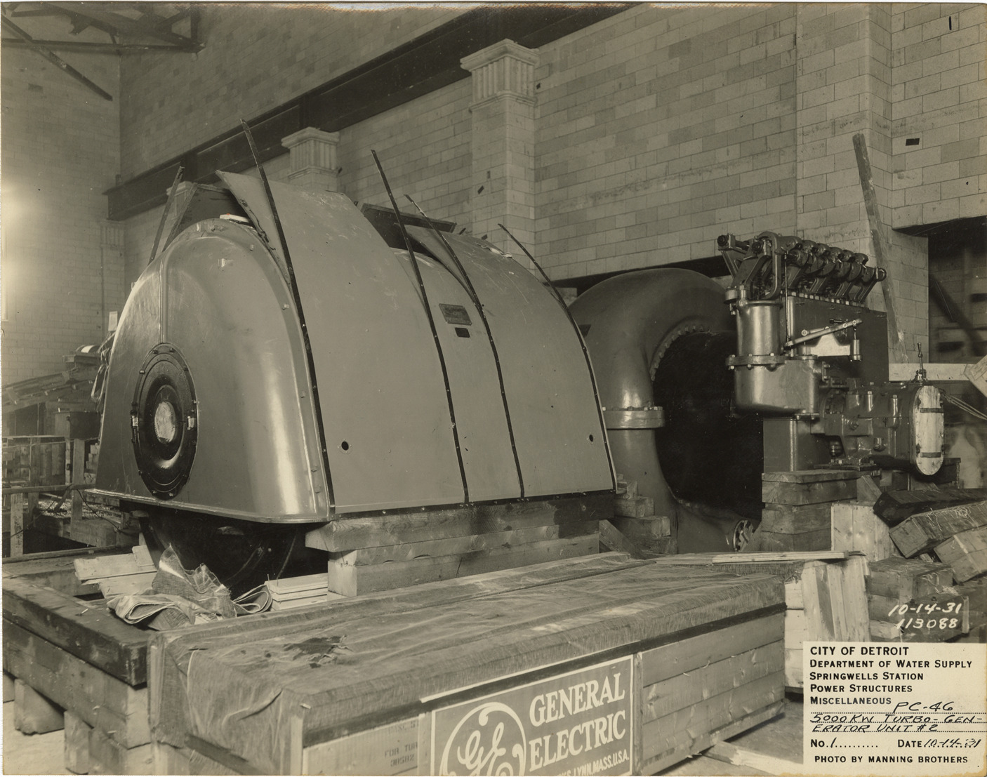 View of General Electric turbogenerator in the Springwells Station treatment plant during construction, Detroit water supply system. Printed on front: "City of Detroit. Department of Water Supply. Springwells Station. Power structures. Miscellaneous. Contract P.C. 46. 5000 KW turbo-generator. Unit #2. No. 1. Date: 10-14-31. Photo by Manning Brothers."