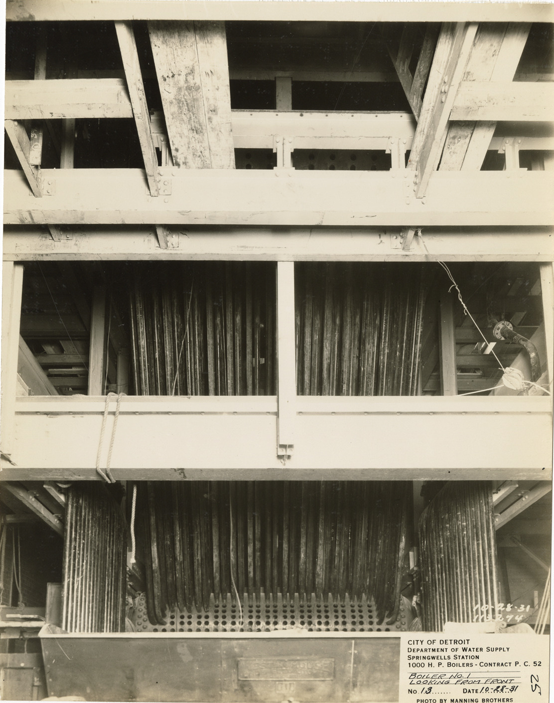 View of boiler in the Springwells Station treatment plant during construction, Detroit water supply system. Printed on front: "City of Detroit. Department of Water Supply. Springwells Station. 1000 h.p. boilers. Contract P.C. 52. Boiler no. 1. Looking from front. No. 13. Date: 10-28-31. Photo by Manning Brothers."