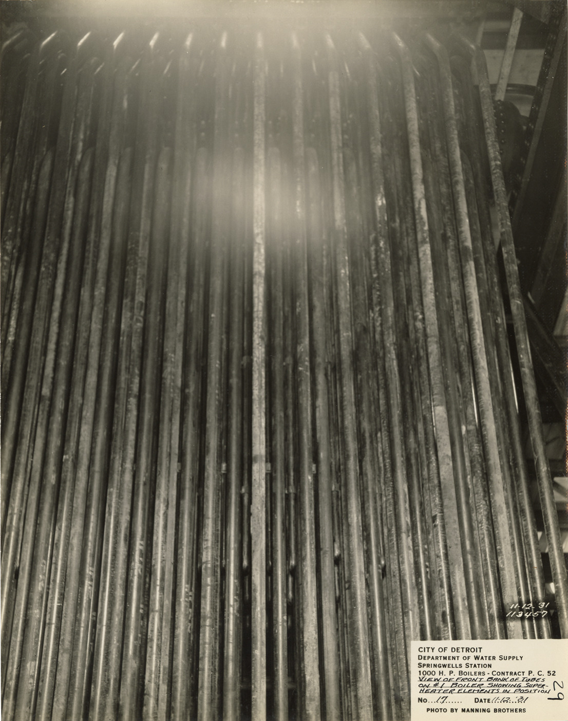 View of boiler tubes in the Springwells Station treatment plant during construction, Detroit water supply system. Printed on front: "City of Detroit. Department of Water Supply. Springwells Station. 1000 h.p. boilers. Contract P.C. 52. View of front bank of tubes on #1 boiler showing superheater elements in position. No. 17. Date: 11-12-31. Photo by Manning Brothers."