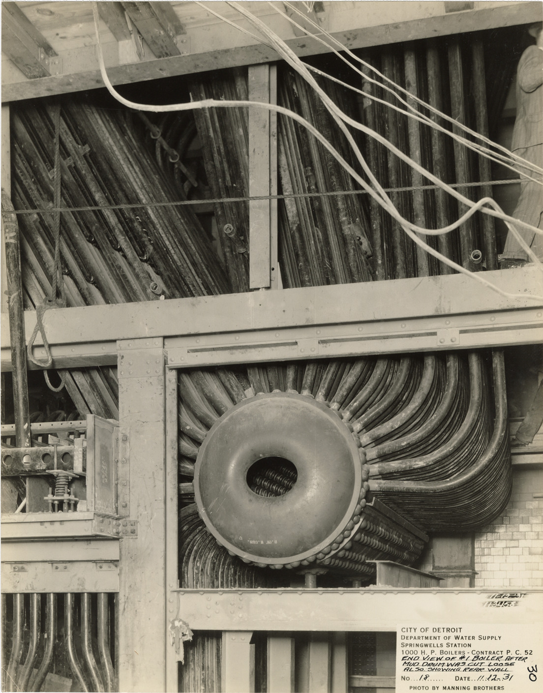 View of boiler in the Springwells Station treatment plant during construction, Detroit water supply system. Printed on front: "City of Detroit. Department of Water Supply. Springwells Station. 1000 h.p. boilers. Contract P.C. 52. End view of #1 boiler after mud drum was cut loose also showing rear wall. No. 18. Date: 11-12-31. Photo by Manning Brothers."