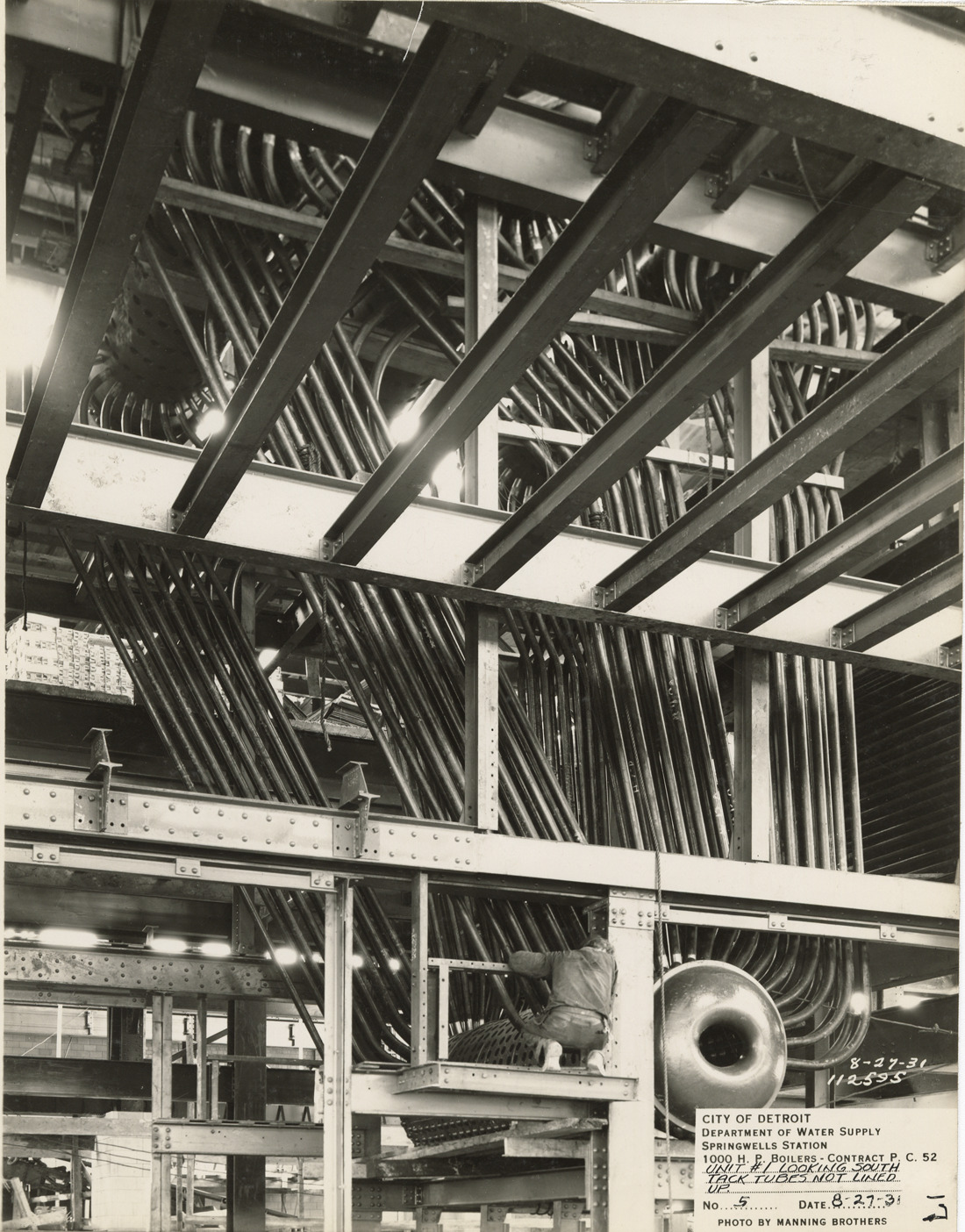 View of boiler tubes in the Springwells Station treatment plant during construction, Detroit water supply system. Printed on front: "City of Detroit. Department of Water Supply. Springwells Station. 1000 h.p. boilers. Contract P.C. 52. Unit #1 looking south. Tack tubes not lined up. No. 5. Date: 8-27-31. Photo by Manning Brothers."