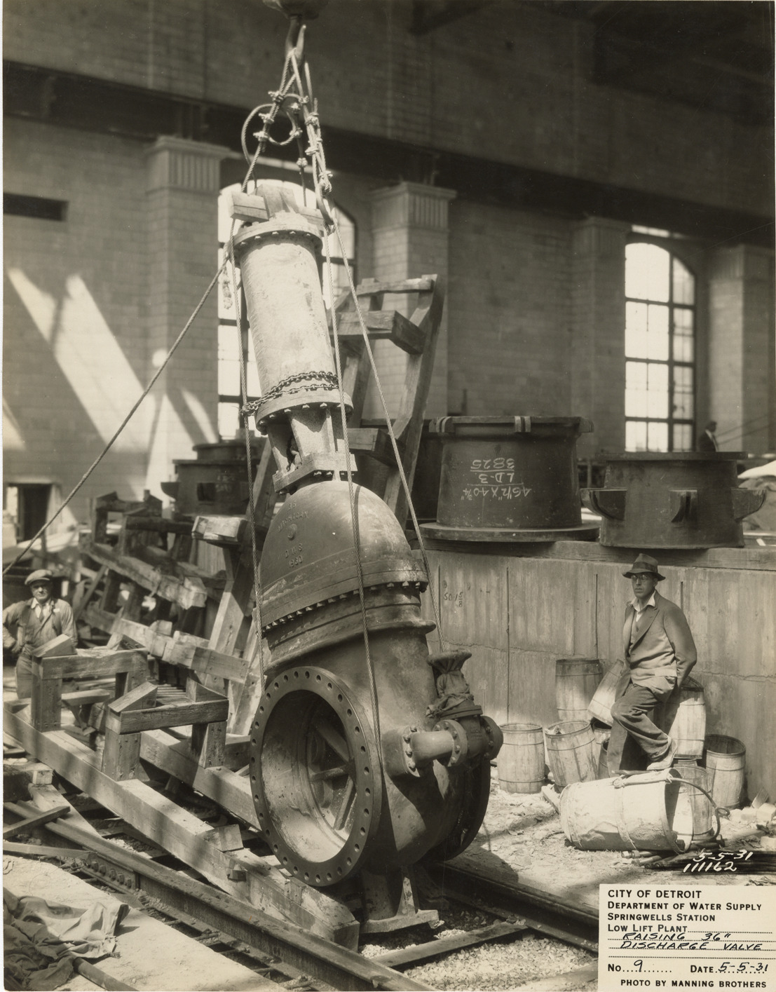 View of two workers standing next to discharge valve on hoist during construction of low lift plant in the Springwells Station treatment plant, Detroit water supply system. Printed on front: "City of Detroit. Department of Water Supply. Springwells Station. Low lift plant. Raising 36" discharge valve. No. 9. Date: 5-5-31. Photo by Manning Brothers."