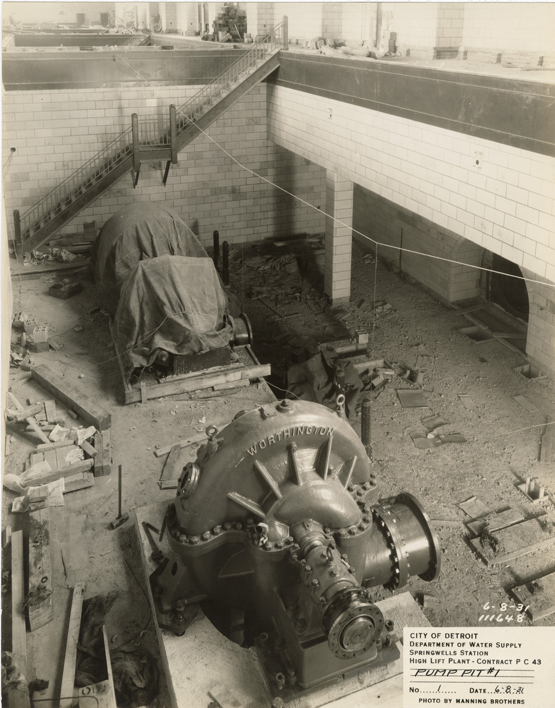 View of pump pit with Worthington pump during construction of high lift plant in the Springwells Station treatment plant, Detroit water supply system. Printed on front: "City of Detroit. Department of Water Supply. Springwells Station. High lift plant. Contract P.C. 43. Pump pit #1. No. 1. Date: 6-8-31. Photo by Manning Brothers."