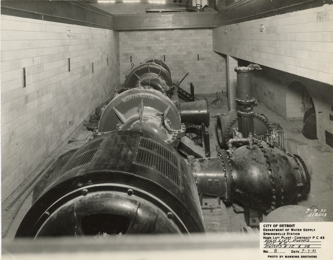 View of pump pit with Worthington pumps during construction of high lift plant in the Springwells Station treatment plant, Detroit water supply system. Two men in background. Printed on front: "City of Detroit. Department of Water Supply. Springwells Station. High lift plant. Contract P.C. 43. High lift pumps. Pit #2. Pumps #12 & 14. No. 8. Date: 7-7-31. Photo by Manning Brothers."