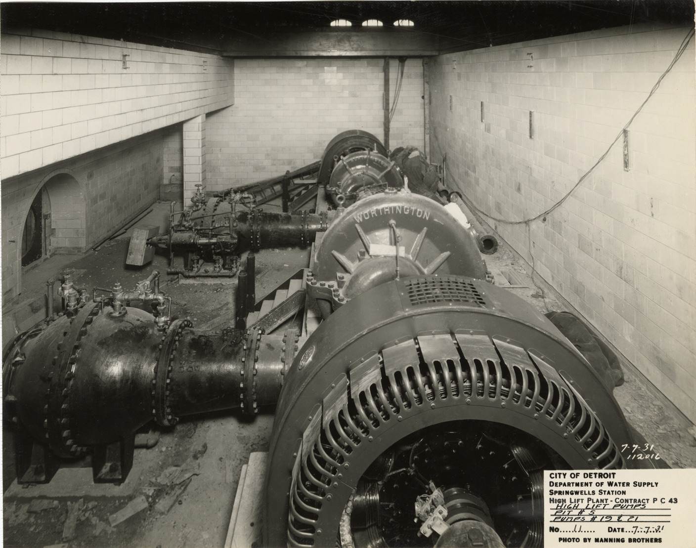 View of pump pit with Worthington pumps during construction of high lift plant in the Springwells Station treatment plant, Detroit water supply system. Printed on front: "City of Detroit. Department of Water Supply. Springwells Station. High lift plant. Contract P.C. 43. High lift pumps. Pit #5. Pumps #19 & 20. No. 11. Date: 7-7-31. Photo by Manning Brothers."