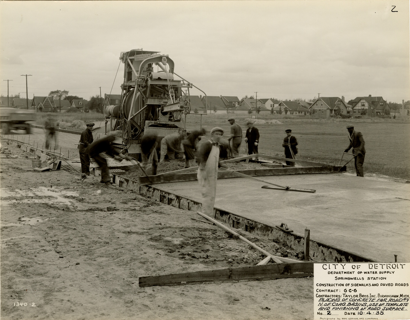 View of workers pouring concrete for road at the Springwells Station, Detroit water supply system. Printed on front: "City of Detroit. Department of Water Supply. Springwells Station. Construction of sidewalks and paved roads. Contract: GC-6. Contractors: Taylor Bros. Inc., Birmingham, Mich. Placing of concrete for road #4. N. of coag. basins, use of template and finishing of road surface. No. 2. Date: 10-4-35. Photographs by MacGregor and Company."