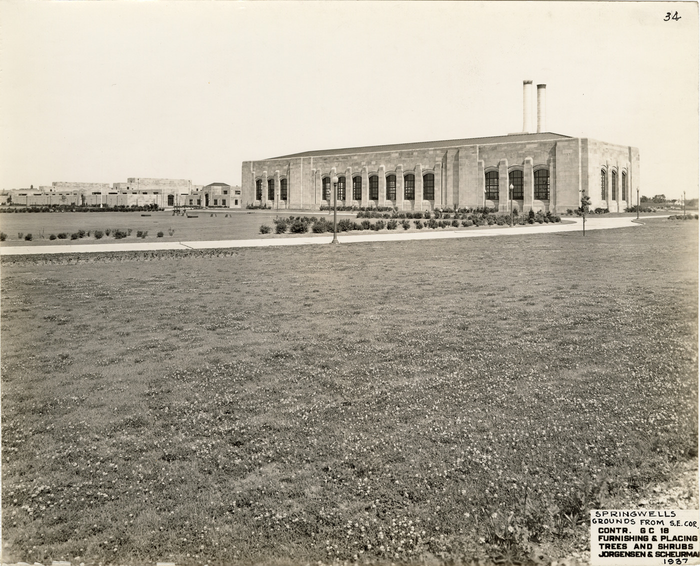 View of shrub and trees on grounds of Springwells Station, Detroit water supply system. Printed on front: "Springwells grounds from S.E. cor. Contr. GC 18. Furnishing & placing trees and shrubs. Jorgensen & Scheurman, 1937." Stamped on back: "Meteor Photo Co."