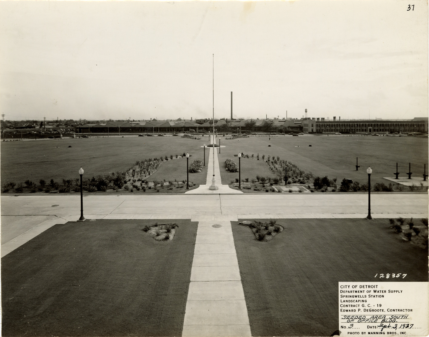 View of seeded area south of office building, Springwells Station, Detroit water supply system. Printed on front: "City of Detroit. Department of Water Supply. Springwells Station. Landscaping. Contract G.C.-19. Edward P. DeGroote, contractor. Seeded area south of office bldg. No. 3. Date: Sept. 3, 1937. Photo by Manning Bros., Inc." Handwritten on back: "Springwells grounds at front of buildings looking south towards Warren Avenue."