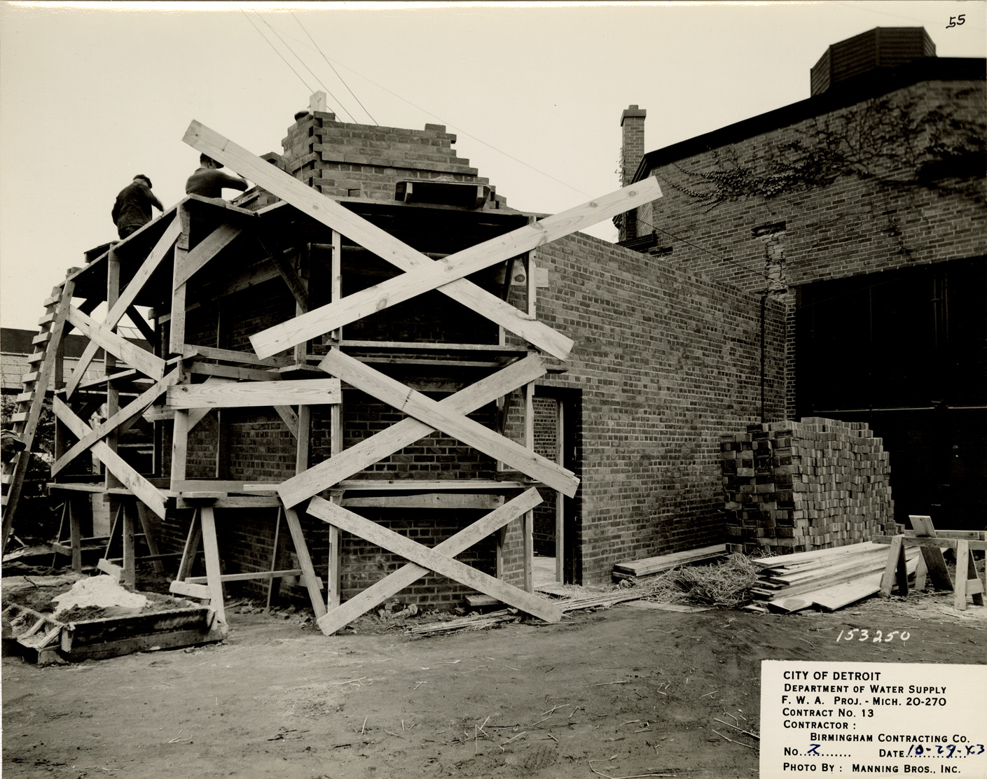 View of two bricklayers constructing an unidentified structure, Springwells Station, Detroit water supply system. Printed on front: "City of Detroit. Department of Water Supply. F.W.A. Proj. - Mich. 20-270. Contract no. 13. Contractor: Birmingham Contracting Co. No. 2. Date: 10-29-43. Photo by Manning Bros., Inc."