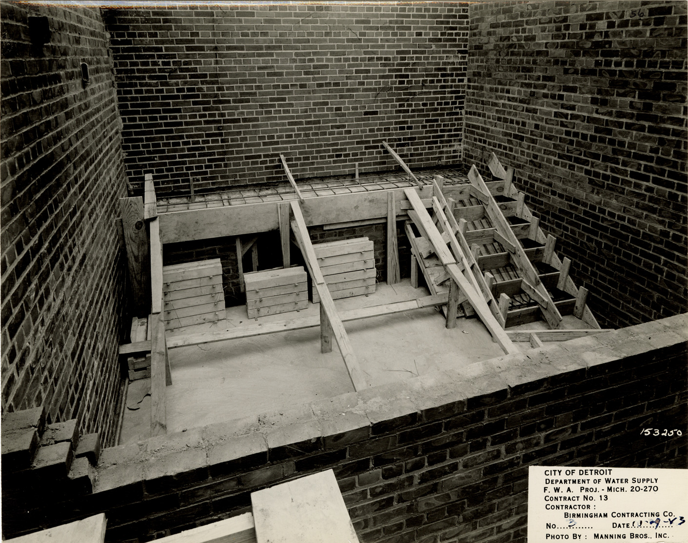 View of the interior of an unidentified brick structure during construction, Springwells Station, Detroit water supply system. Printed on front: "City of Detroit. Department of Water Supply. F.W.A. Proj. - Mich. 20-270. Contract no. 13. Contractor: Birmingham Contracting Co. No. 3. Date: 10-29-43. Photo by Manning Bros., Inc."